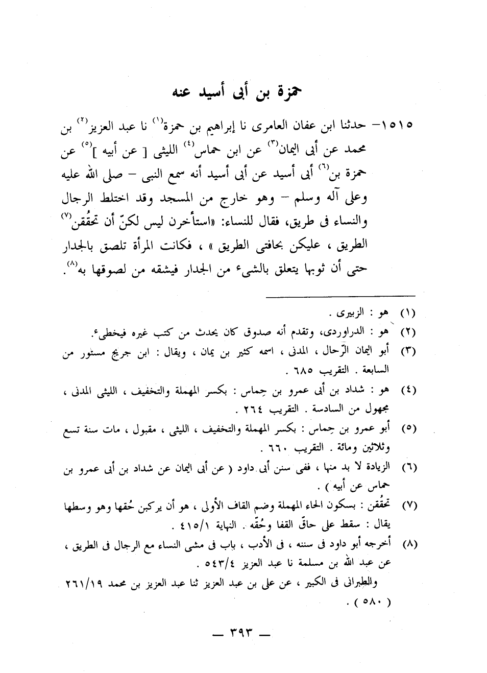 1515 - حَدَّثَنَا ابْنُ عَفَّانَ الْعَامِرِيُّ، نا إِبْرَاهِيمُ بْنُ حَمْزَةَ، نا عَبْدُ الْعَزِيزِ بْنُ مُحَمَّدٍ، عَنْ أَبِي الْيَمَانِ، عَنِ ابْنِ حِمَاسٍ اللَّيْثِيِّ، عَنْ أَبِيهِ، عَنْ حَمْزَةَ بْنِ أَبِي أُسَيْدٍ، عَنْ أَبِي أُسَيْدٍ، أَنَّهُ سَمِعَ النَّبِيَّ صَلَّى اللَّهُ عَلَيْهِ وَعَلَى آلِهِ وَسَلَّمَ وَهُوَ خَارِجٌ مِنَ الْمَسْجِدِ وَقَدِ اخْتَلَطَ الرِّجَالُ وَالنِّسَاءُ فِي طَرِيقٍ، فَقَالَ لِلنِّسَاءِ: «§اسْتَأْخِرْنَ لَيْسَ لَكُنَّ أَنْ تَحْقُقْنَ الطَّرِيقَ، عَلَيْكُنَّ بِحَافَّتَيِ الطَّرِيقِ، فَكَانَتِ الْمَرْأَةُ تَلْصَقُ بِالْجِدَارِ حَتَّى أَنَّ ثَوْبَهَا يَتَعَلَّقُ بِالشَّيْءِ مِنَ الْجِدَارِ فَيَشُقُّهُ مِنْ لُصُوقِهَا بِهِ»