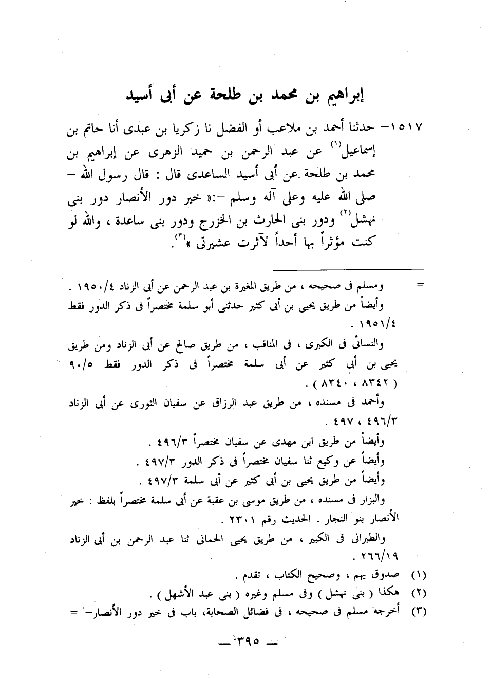 1517 - حَدَّثَنَا أَحْمَدُ بْنُ مُلَاعِبٍ أَوِ الْفَضْلُ، نا زَكَرِيَّا بْنُ عَدِيٍّ، أَنَا حَاتِمُ بْنُ إِسْمَاعِيلَ، عَنْ عَبْدِ الرَّحْمَنِ بْنِ حُمَيْدٍ الزُّهْرِيِّ، عَنْ إِبْرَاهِيمَ بْنِ مُحَمَّدِ بْنِ طَلْحَةَ، عَنْ أَبِي أُسَيْدٍ السَّاعِدِيِّ، قَالَ: قَالَ رَسُولُ اللَّهِ صَلَّى اللَّهُ عَلَيْهِ وَعَلَى آلِهِ وَسَلَّمَ: «§خَيْرُ دُورِ الْأَنْصَارِ دُورُ بَنِي نَهْشَلٍ، ودورُ بَنِي الْحَارِثِ بْنِ الْخَزْرَجِ، ودورُ بَنِي سَاعِدَةَ، وَاللَّهِ لَوْ كُنْتُ مُؤْثِرًا بِهَا أَحَدًا لَآثَرْتُ عَشِيرَتِي»