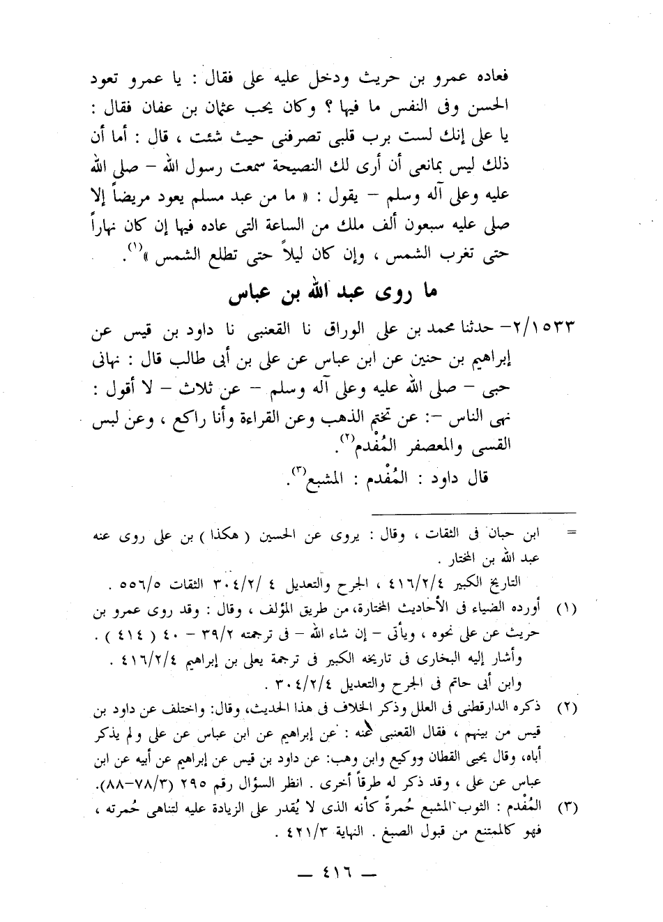 حَدَّثَنَا مُحَمَّدُ بْنُ عَلِيٍّ الْوَرَّاقُ، نا الْقَعْنَبِيُّ، نا دَاوُدُ بْنُ قَيْسٍ، عَنْ إِبْرَاهِيمَ بْنِ حُنَيْنٍ، عَنِ ابْنِ عَبَّاسٍ، عَنْ عَلِيِّ بْنِ أَبِي طَالِبٍ، قَالَ: نَهَانِي حِبِّي صَلَّى اللَّهُ عَلَيْهِ وَعَلَى آلِهِ وَسَلَّمَ عَنْ ثَلَاثٍ - لَا أَقُولُ: §نَهَى النَّاسَ - عَنْ: تَخَتُّمِ الذَّهَبِ، وَعَنِ الْقِرَاءَةِ وَأَنَا رَاكِعٌ، وَعَنْ لُبْسِ الْقَسِّيِّ وَالْمُعَصْفَرِ الْمُفَدَّمِ ". قَالَ دَاوُدُ: الْمُفَدَّمُ: الْمُشْبَّعُ