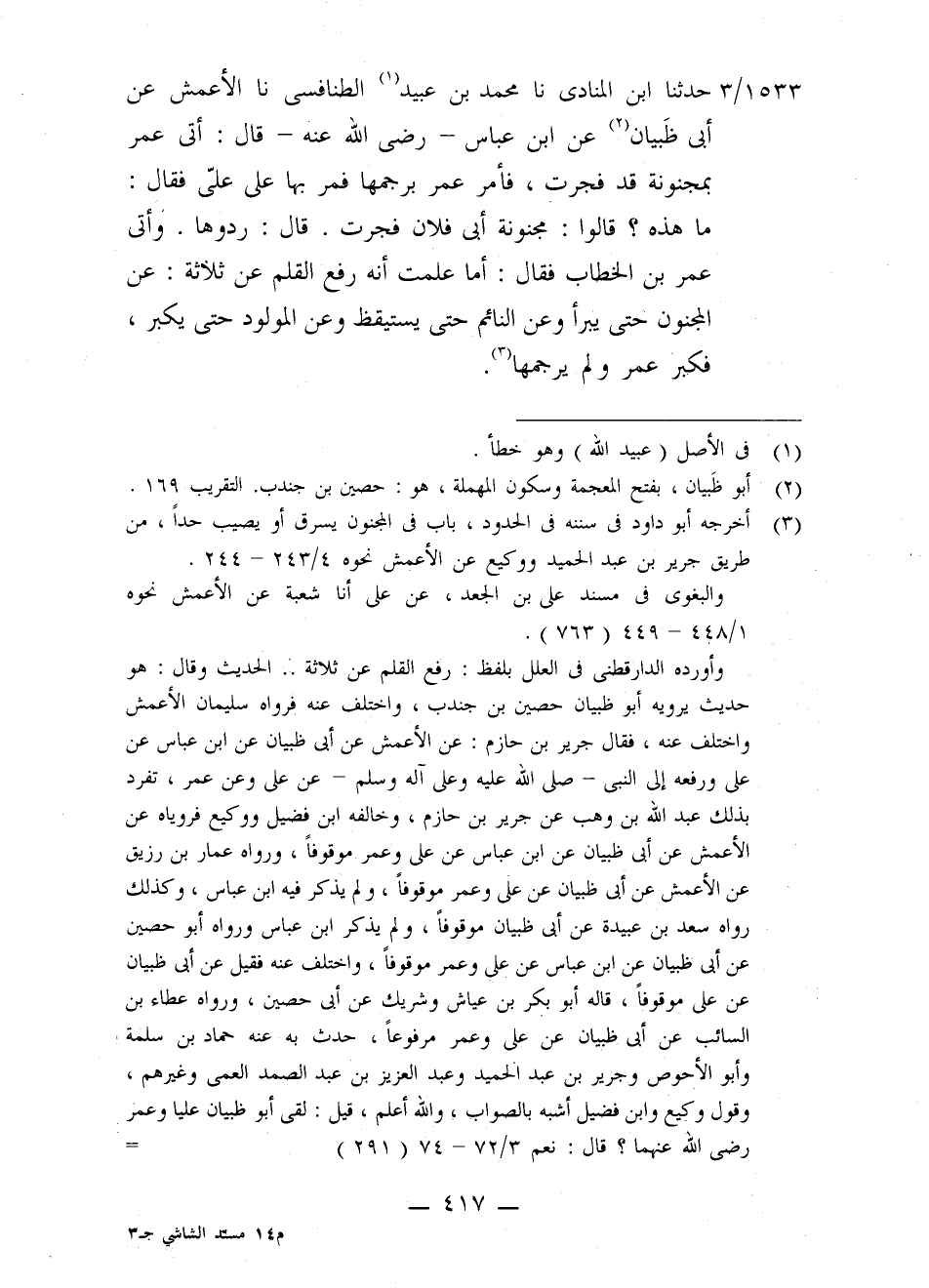 حَدَّثَنَا ابْنُ الْمُنَادِي، نا مُحَمَّدُ بْنُ عُبَيْدٍ الطَّنَافِسِيُّ، نا الْأَعْمَشُ، عَنْ أَبِي ظَبْيَانَ، عَنِ ابْنِ عَبَّاسٍ، رَضِيَ اللَّهُ عَنْهُ قَالَ: " أُتِيَ عُمَرُ بِمَجْنُونَةٍ قَدْ فَجَرَتْ، فَأَمَرَ عُمَرُ بِرَجْمِهَا فَمُرَّ بِهَا عَلَى عَلِيٍّ فَقَالَ: مَا هَذِهِ؟ قَالُوا: مَجْنُونَةُ أَبِي فُلَانٍ فَجَرَتْ. قَالَ: رُدُّوهَا. وَأَتَى عُمَرَ بْنَ الْخَطَّابِ فَقَالَ: أَمَا عَلِمْتَ أَنَّهُ §رُفِعَ الْقَلَمُ عَنْ ثَلَاثَةٍ: عَنِ الْمَجْنُونِ حَتَّى يَبْرَأَ وَعَنِ النَّائِمِ حَتَّى يَسْتَيْقِظَ وَعَنِ الْمَوْلُودِ حَتَّى يَكْبُرَ. فَكَبَّرَ عُمَرُ وَلَمْ يَرْجُمُهَا "