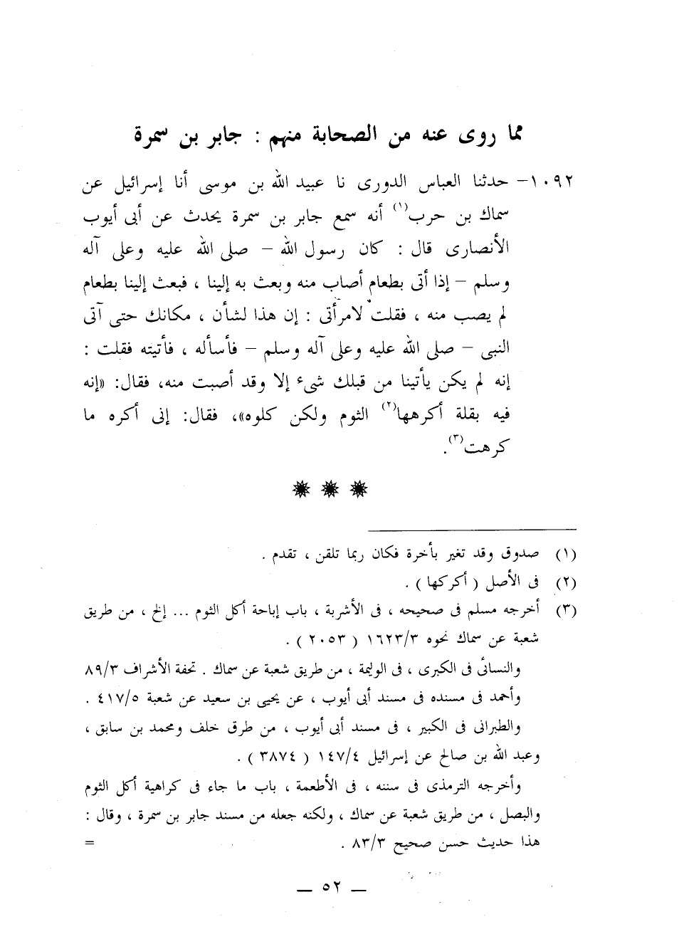 1092 - حَدَّثَنَا الْعَبَّاسُ الدُّورِيُّ، نا عُبَيْدُ اللَّهِ بْنُ مُوسَى، أنا إِسْرَائِيلُ، عَنْ سِمَاكِ بْنِ حَرْبٍ، أَنَّهُ سَمِعَ جَابِرَ بْنَ سَمُرَةَ، يُحَدِّثُ عَنْ أَبِي أَيُّوبَ الْأَنْصَارِيِّ، قَالَ: كَانَ رَسُولُ اللَّهِ صَلَّى اللَّهُ عَلَيْهِ وَعَلَى آلِهِ وَسَلَّمَ، §إِذَا أُتِيَ بِطَعَامٍ أَصَابَ مِنْهُ وَبَعَثَ بِهِ إِلَيْنَا، فَبَعَثَ إِلَيْنَا بِطَعَامٍ لَمْ يُصِبْ مِنْهُ، فَقُلْتُ لِامْرَأَتِي: إِنَّ هَذَا لَشَأْنٌ، مَكَانَكِ حَتَّى آتِيَ النَّبِيَّ صَلَّى اللَّهُ عَلَيْهِ وَعَلَى آلِهِ وَسَلَّمَ فَأَسْأَلَهُ، فَأَتَيْتُهُ فَقُلْتُ: إِنَّهُ لَمْ يَكُنْ يَأْتِينَا مِنْ قِبَلِكَ شَيْءٌ إِلَّا وَقَدْ أَصَبْتَ مِنْهُ، فَقَالَ: إِنَّهُ فِيهِ بَقْلَةٌ أَكْرَهُهَا، الثُّوْمُ، وَلَكِنْ كُلُوهُ فَقَالَ: إِنِّي أَكْرَهُ مَا كَرِهْتَ