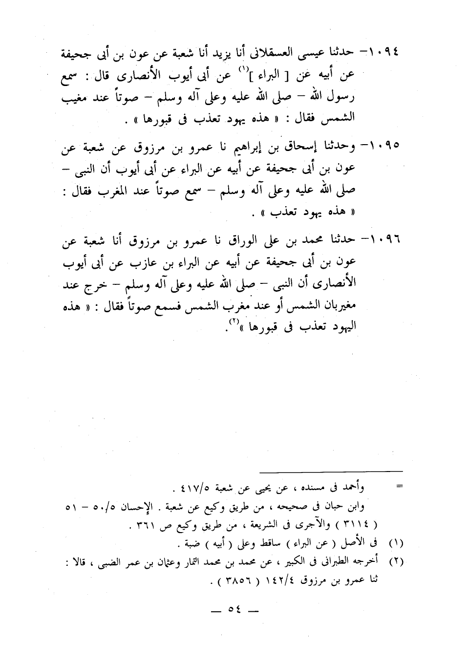 1094 - حَدَّثَنَا عِيسَى الْعَسْقَلَانِيُّ، أنا يَزِيدُ، أنا شُعْبَةُ، عَنْ عَوْنِ بْنِ أَبِي جُحَيْفَةَ، عَنْ أَبِيهِ، عَنِ الْبَرَاءِ، عَنْ أَبِي أَيُّوبَ الْأَنْصَارِيِّ، قَالَ: سَمِعَ رَسُولَ اللَّهِ صَلَّى اللَّهُ عَلَيْهِ وَعَلَى آلِهِ وَسَلَّمَ صَوْتًا عِنْدَ مَغِيبِ الشَّمْسِ فَقَالَ: «§هَذِهِ يَهُودُ تُعَذَّبُ فِي قُبُورِهَا»
