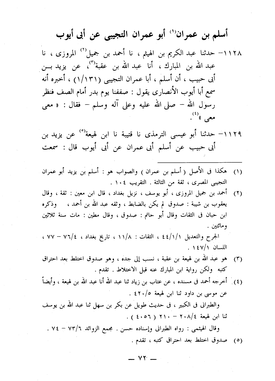 1128 - حَدَّثَنَا عَبْدُ الْكَرِيمِ بْنُ الْهَيْثَمِ، نا أَحْمَدُ بْنُ جَمِيلٍ الْمَرْوَزِيُّ، نا عَبْدُ اللَّهِ بْنُ الْمُبَارَكِ، أنا عَبْدُ اللَّهِ بْنُ عُقْبَةَ، عَنْ يَزِيدَ بْنِ أَبِي حَبِيبٍ، أَنَّ أَسْلَمَ أَبَا عِمْرَانَ التُّجِيبِيَّ، أَخْبَرَهُ , أَنَّهُ سَمِعَ أَبَا أَيُّوبَ الْأَنْصَارِيَّ، يَقُولُ: §صَفَفْنَا يَوْمَ بَدْرٍ أَمَامَ الصَّفِّ فَنَظَرَ رَسُولُ اللَّهِ صَلَّى اللَّهُ عَلَيْهِ وَآلِهِ وَسَلَّمَ فَقَالَ: «مَعِي مَعِي»