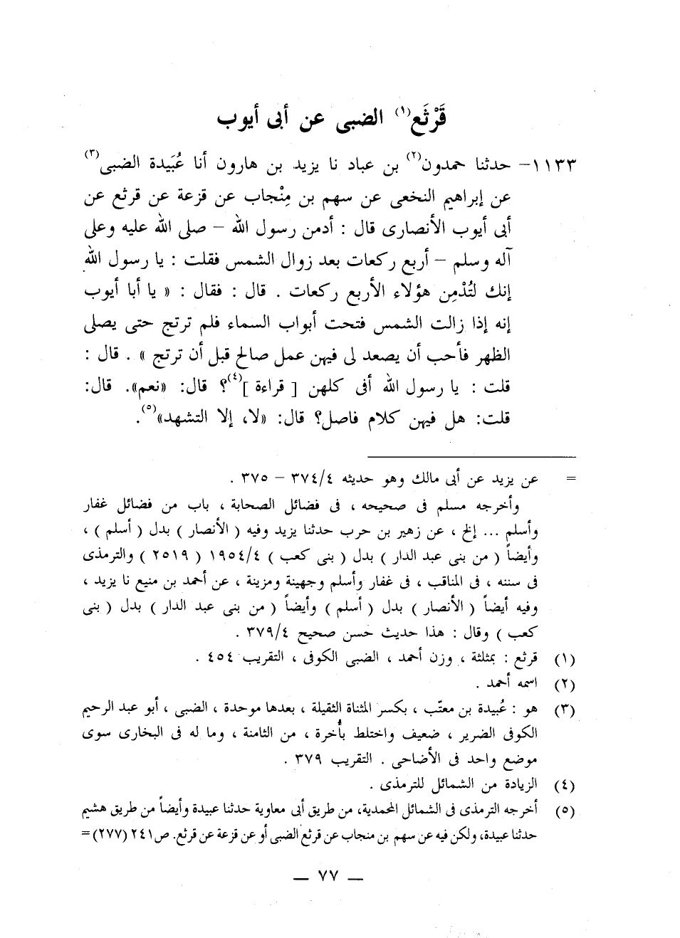 1133 - حَدَّثَنَا حَمْدُونُ بْنُ عَبَّادٍ، نا يَزِيدُ بْنُ هَارُونَ، أنا عُبَيْدَةُ الضَّبِّيُّ، عَنْ إِبْرَاهِيمَ النَّخَعِيِّ، عَنْ سَهْمِ بْنِ مِنْجَابٍ، عَنْ قَزَعَةَ، عَنْ قَرْثَعٍ، عَنْ أَبِي أَيُّوبَ الْأَنْصَارِيِّ، قَالَ: أَدْمَنَ رَسُولُ اللَّهِ صَلَّى اللَّهُ عَلَيْهِ وَعَلَى آلِهِ وَسَلَّمَ أَرْبَعَ رَكَعَاتٍ بَعْدَ زَوَالِ الشَّمْسِ فَقُلْتُ: يَا رَسُولَ اللَّهِ إِنَّكَ لَتُدْمِنُ هَؤُلَاءِ الْأَرْبَعَ رَكَعَاتٍ. قَالَ: فَقَالَ: «يَا أَبَا أَيُّوبَ إِنَّهُ §إِذَا زَالَتِ الشَّمْسُ فُتِحَتْ أَبْوَابُ السَّمَاءِ فَلَمْ تَرْتَجَّ حَتَّى يُصَلَّى الظُّهْرُ , فَأَحِبُّ أَنْ يَصْعَدَ لِي فِيهِنَّ عَمَلٌ صَالِحٌ قَبْلَ أَنْ تَرْتَجَّ» قَالَ: قُلْتُ: يَا رَسُولَ اللَّهِ أَفِي كُلِّهِنَّ قِرَاءَةٌ؟ قَالَ: «نَعَمْ» قَالَ: قُلْتُ: هَلْ فِيهِنَّ كَلَامٌ فَاصِلٌ؟ قَالَ: «لَا، إِلَّا التَّشَهُّدُ»