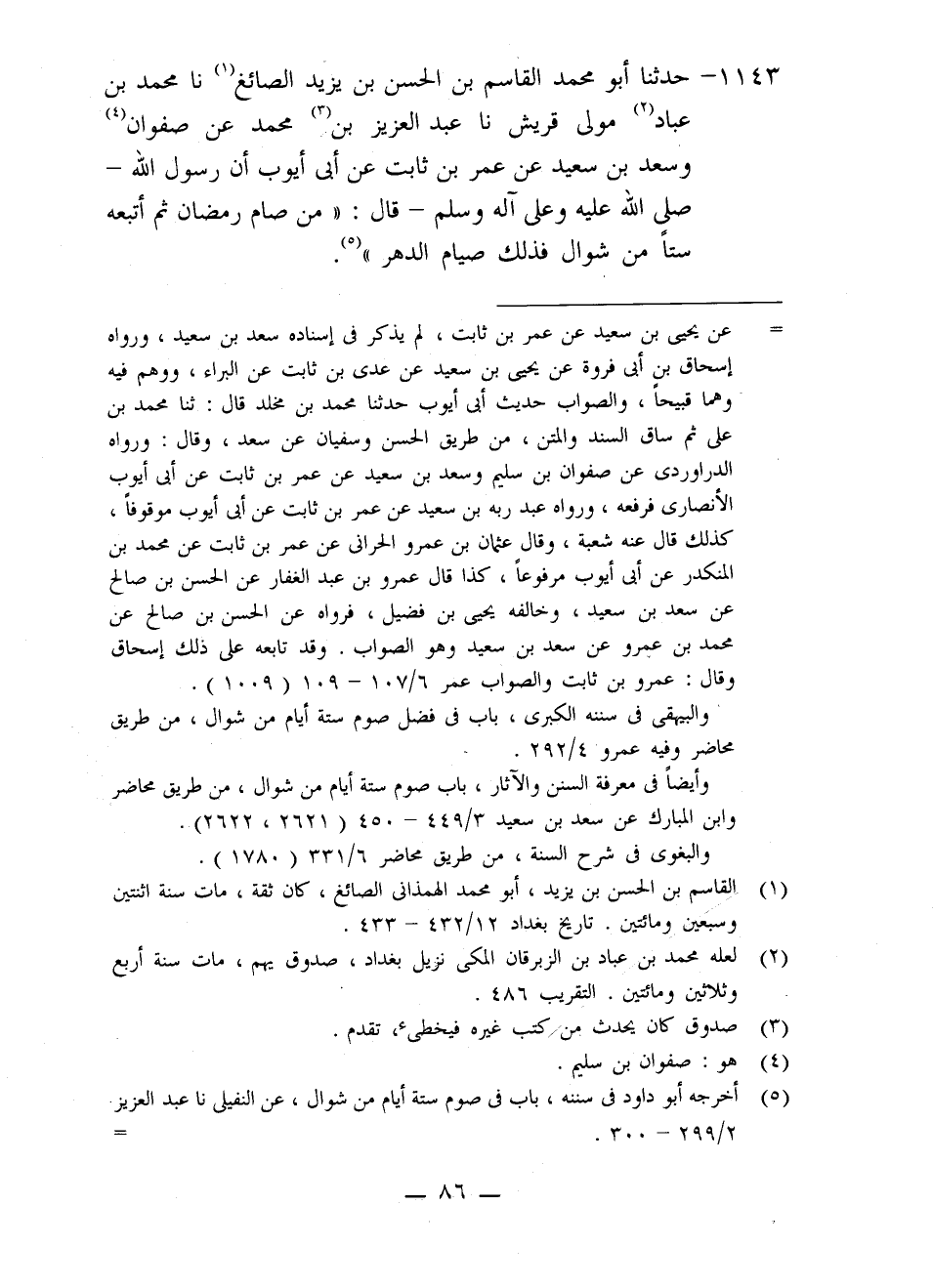 1143 - حَدَّثَنَا أَبُو مُحَمَّدٍ الْقَاسِمُ بْنُ الْحَسَنِ بْنِ يَزِيدَ الصَّائِغُ، نا مُحَمَّدُ بْنُ عَبَّادٍ، مَوْلَى قُرَيْشٍ , نا عَبْدُ الْعَزِيزِ بْنُ مُحَمَّدٍ، عَنْ صَفْوَانَ، وَسَعْدِ بْنِ سَعِيدٍ، عَنْ عُمَرَ بْنِ ثَابِتٍ، عَنْ أَبِي أَيُّوبَ، أَنَّ رَسُولَ اللَّهِ صَلَّى اللَّهُ عَلَيْهِ وَعَلَى آلِهِ وَسَلَّمَ قَالَ: «§مَنْ صَامَ رَمَضَانَ ثُمَّ أَتْبَعَهُ سِتًّا مِنْ شَوَّالٍ فَذَلِكَ صِيَامُ الدَّهْرِ»