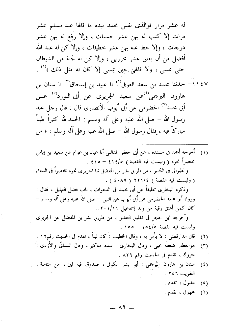 1147 - حَدَّثَنَا مُحَمَّدُ بْنُ سَعِيدٍ الْعَوْفِيُّ، نا عُبَيْدُ بْنُ إِسْحَاقَ، نا سِنَانُ بْنُ هَارُونَ الْبُرْجُمِيُّ، عَنْ سَعِيدٍ الْجُرَيْرِيِّ، عَنْ أَبِي الْوَرْدِ، عَنْ أَبِي مُحَمَّدٍ الْحَضْرَمِيِّ، عَنْ أَبِي أَيُّوبَ الْأَنْصَارِيِّ، قَالَ: قَالَ رَجُلٌ عِنْدَ رَسُولِ اللَّهِ صَلَّى اللَّهُ عَلَيْهِ وَعَلَى آلِهِ وَسَلَّمَ: §الْحَمْدُ لِلَّهِ كَثِيرًا طَيِّبًا مُبَارَكًا فِيهِ، فَقَالَ رَسُولُ اللَّهِ صَلَّى اللَّهُ عَلَيْهِ وَعَلَى آلِهِ وَسَلَّمَ: «مَنْ -[90]- صَاحِبُ الْكَلِمَةِ؟» فَسَكَتَ الرَّجُلُ خَشْيَةَ أَنْ يَكُونَ مِنْ رَسُولِ اللَّهِ عَلَى شَيْءٍ لَا يَدْرِي بِالْكَلِمَةِ مَا هُوَ؟ ثُمَّ قَالَ: «مَنْ صَاحِبُ الْكَلِمَةِ؟ فَإِنَّهَا كَلِمَةُ صَوَابٍ» . فَقَالَ الرَّجُلُ: أَنَا يَا رَسُولَ اللَّهِ قُلْتُهَا أَرْجُو بِهَا الْخَيْرَ، قَالَ: «وَالَّذِي نَفْسِي بِيَدِهِ لَقَدْ رَأَيْتُ ثَلَاثَةَ عَشَرَ يَبْتَدِرُونَهَا أَيُّهُمْ يَرْفَعُهَا إِلَى اللَّهِ تَبَارَكَ وَتَعَالَى»