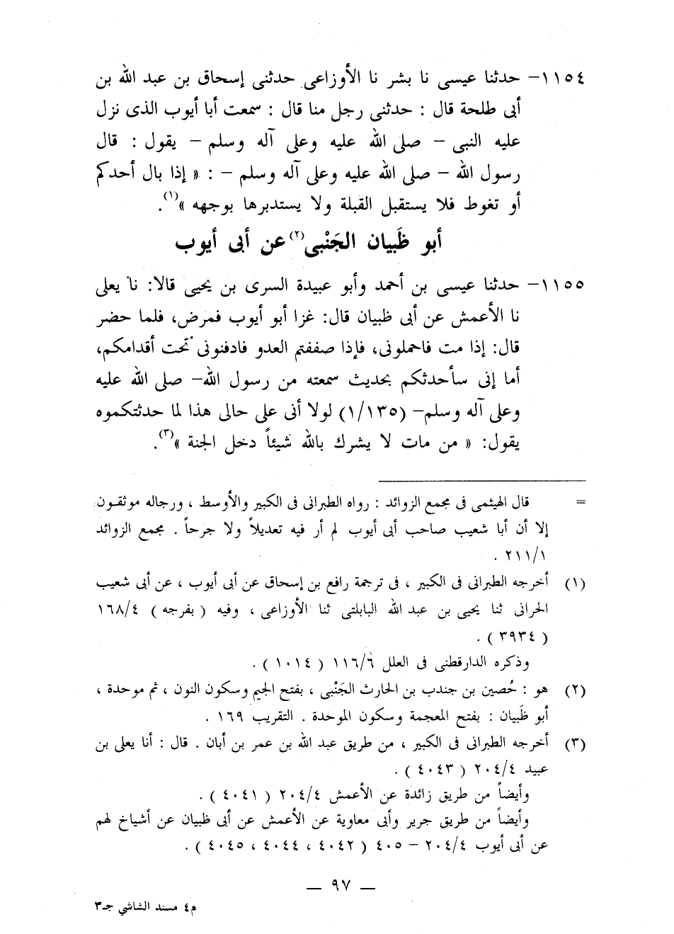 1155 - حَدَّثَنَا عِيسَى بْنُ أَحْمَدَ، وَأَبُوعُبَيْدَةَ السَّرِيُّ بْنُ يَحْيَى قَالَا: نا يَعْلَى، نا الْأَعْمَشُ، عَنْ أَبِي ظَبْيَانَ، قَالَ: غَزَا أَبُو أَيُّوبَ فَمَرِضَ، فَلَمَّا حَضَرَ قَالَ: إِذَا مِتُّ فَاحْمِلُونِي، فَإِذَا صَفَفْتُمُ الْعَدُوَّ فَادْفِنُونِي تَحْتَ أَقْدَامِكُمْ، أَمَا إِنِّي سَأُحَدِّثُكُمْ بِحَدِيثٍ سَمِعْتُهُ مِنْ رَسُولِ اللَّهِ صَلَّى اللَّهُ عَلَيْهِ وَعَلَى آلِهِ وَسَلَّمَ , لَوْلَا أَنِّي عَلَى حَالِي هَذَا لَمَا حَدَّثْتُكُمُوهُ، يَقُولُ: «§مَنْ مَاتَ لَا يُشْرِكُ بِاللَّهِ شَيْئًا دَخَلَ الْجَنَّةَ»