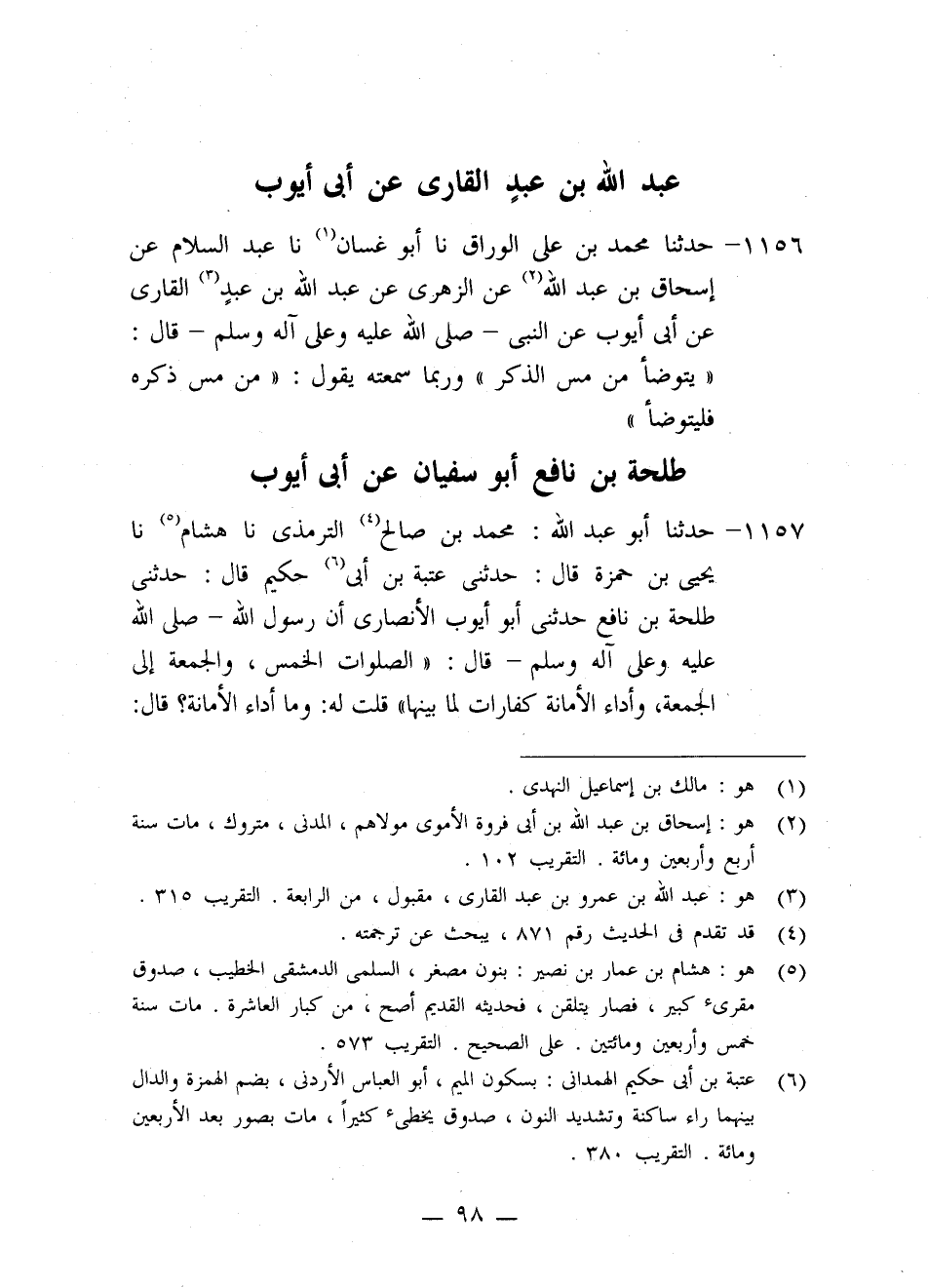 1156 - حَدَّثَنَا مُحَمَّدُ بْنُ عَلِيٍّ الْوَرَّاقُ، نا أَبُو غَسَّانَ، نا عَبْدُ السَّلَامِ، عَنْ إِسْحَاقَ بْنِ عَبْدِ اللَّهِ، عَنِ الزُّهْرِيِّ، عَنْ عَبْدِ اللَّهِ بْنِ عَبْدٍ الْقَارِي، عَنْ أَبِي أَيُّوبَ، عَنِ النَّبِيِّ صَلَّى اللَّهُ عَلَيْهِ وَعَلَى آلِهِ وَسَلَّمَ قَالَ: «§يَتَوَضَّأُ مَنْ مَسَّ الذَّكَرَ» وَرُبَّمَا سَمِعْتُهُ يَقُولُ: «مَنْ مَسَّ ذَكَرَهُ فَلْيَتَوَضَّأْ»