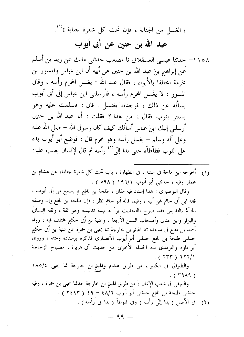 1158 - حَدَّثَنَا عِيسَى الْعَسْقَلَانِيُّ، نا مُصْعَبٌ، حَدَّثَنِي مَالِكٌ، عَنْ زَيْدِ بْنِ أَسْلَمَ، عَنْ إِبْرَاهِيمَ بْنِ عَبْدِ اللَّهِ بْنِ حُنَيْنٍ، عَنْ أَبِيهِ، أَنَّ ابْنَ عَبَّاسٍ، وَالْمِسْوَرَ بْنَ مَخْرَمَةَ، اخْتَلَفَا بِالْأَبْوَاءِ , فَقَالَ عَبْدُ اللَّهِ: يَغْسِلُ الْمُحْرِمُ رَأْسَهُ، وَقَالَ الْمِسْوَرُ: لَا يَغْسِلُ الْمُحْرِمُ رَأْسَهُ، فَأَرْسَلَنِي ابْنُ عَبَّاسٍ إِلَى أَبِي أَيُّوبَ يَسْأَلُهُ عَنْ ذَلِكَ، فَوَجَدْتُهُ يَغْتَسِلُ، قَالَ: فَسَلَّمْتُ عَلَيْهِ وَهُوَ يَسْتَتِرُ بِثَوْبٍ فَقَالَ: مَنْ هَذَا؟، فَقُلْتُ: أَنَا عَبْدُ اللَّهِ بْنُ حُنَيْنٍ أَرْسَلَنِي إِلَيْكَ ابْنُ عَبَّاسٍ أَسْأَلُكَ كَيْفَ كَانَ رَسُولُ اللَّهِ صَلَّى اللَّهُ عَلَيْهِ وَعَلَى آلِهِ وَسَلَّمَ يَغْسِلُ رَأْسَهُ وَهُوَ مُحْرِمٌ؟ قَالَ: §فَوَضَعَ أَبُو أَيُّوبَ يَدَهُ عَلَى الثَّوْبِ فَطَأْطَأَهُ حَتَّى بَدَا إِلَيَّ رَأْسُهُ ثُمَّ قَالَ لِإِنْسَانٍ يَصُبُّ عَلَيْهِ -[100]-: اصْبُبْ، فَصَبَّ عَلَى رَأْسِهِ ثُمَّ حَرَّكَ بِيَدَيْهِ فَأَقْبَلَ بِهِمَا وَأَدْبَرَ ثُمَّ قَالَ: هَكَذَا رَأَيْتُهُ يَفْعَلُ