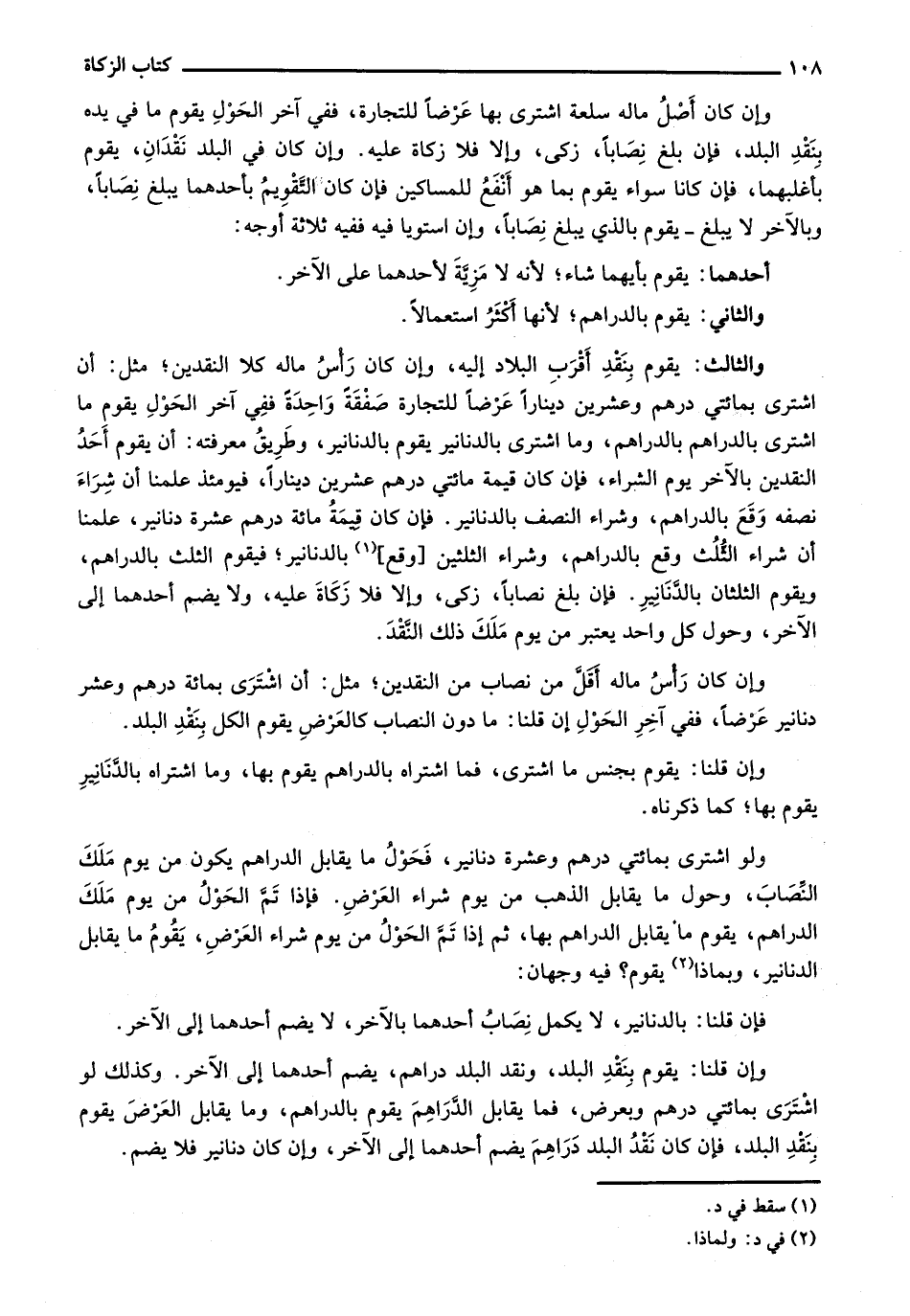 وإن كان رأس ماله أقل من نصاب من النقدين؛ مثل: أن اشترى بمائة درهم وعشر دنانير عرضاً، ففي آخر الحول إن قلنا: ما دون النصاب كالعرض يقوم الكل بنقد البلد.
