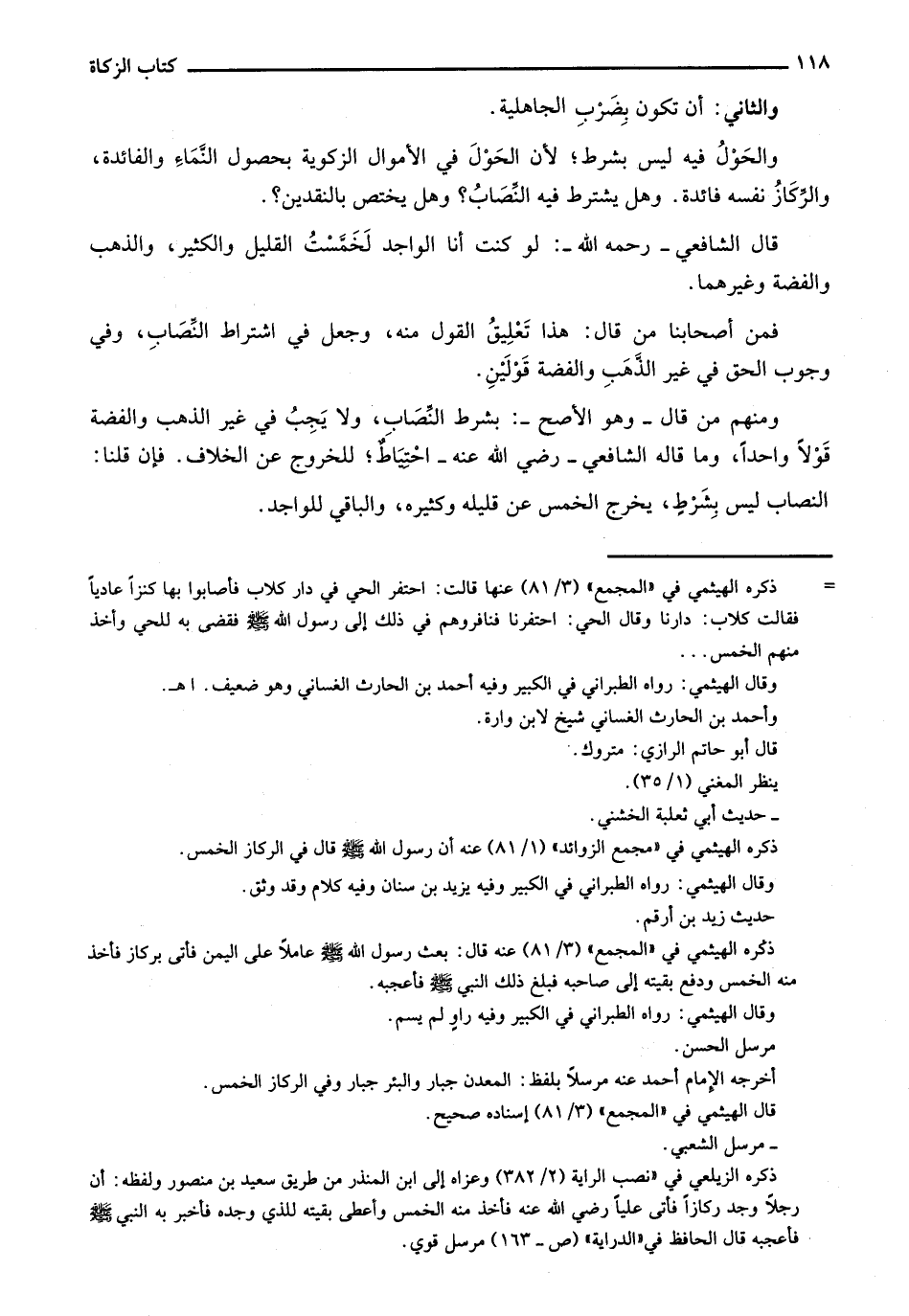 والحول فيه ليس بشرط؛ لأن الحول في الأموال الزكوية بحصول النماء اولفائدة، والركاز نفسه فائدة. وهل يشترط فيه النصاب وهل يختص بالنقدين؟