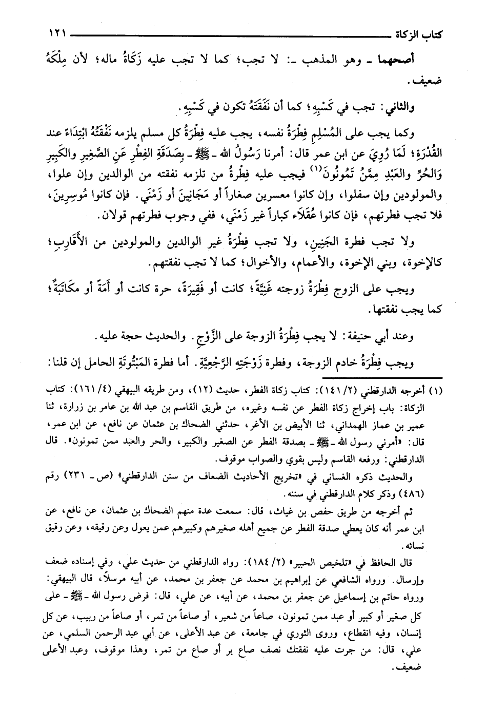 وكما يجب على المسلم فطرة نفسه، يجب عليه فطرة كل مسلم يلزمه نفقته ابتداء عند القدرة؛ لما رُوي عن ابن عمر قال: أمرنا رسول الله - صلى الله عليه وسلم - بصدقة الفطر عن الصغير والكبير والحر والعبد ممن تمونون فيجب عليه فطرة من تلزمه نفقته من الوالدين وإن علوا، والمولودين وإن سفلوا، وإن كانوا معسرين صغاراً أو مجانين أو زمنى. فإن كانوا موسرين، فلا تجب فطرتهم، فإن كانوا عقلاء كباراً غير زمني. فإن كانوا موسرين، فلا تجب فطرتهم، فإن كانوا عقلاء كباراً غير زمني، ففي وجوب فطرتهم قولان.