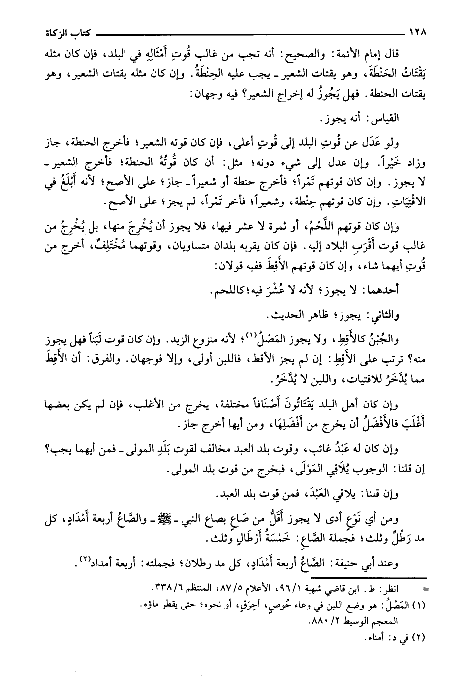 وإن كان قوتهم اللحم، أو ثمرة لا عشر فيها، فلا يجوز أن يُخرج منها، بل يخرج من غالب قوت أقرب البلاد إليه. فإن كان يقربه بلدان متساويان، وقوتهما مختلفٌ، أخرج من قوت أيهما شاء، وإن كنا قوتهم الأقط ففيه قولان: