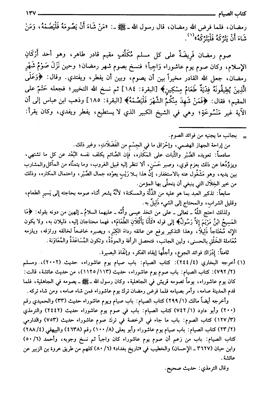 صوم رمضان فريضة على كل مسلم مكلف مقيم قادر طاهر، وهو أحد أركان الإسلام، وكان صوم يوم عاشوراء واجباً؛ فنسخ بصوم شهر رمضان؛ وحين نزل صوم شهر رمضان، جعل الله القادر مخيراً بين أن يصوم، وبين أن يفطر، ويفتدي. وقال: {وَعَلَى الَّذِينَ يُطِيقُونَهُ فِدْيَةٌ طَعَامُ مِسْكِينٍ} [البقرة: 185] وذهب ابن عباس إلى أن الآية غير منسوخة؛ وهي في الشيخ الكبير الذي لا يستطيع، يفطر ويفدي، وكان يقرأ: