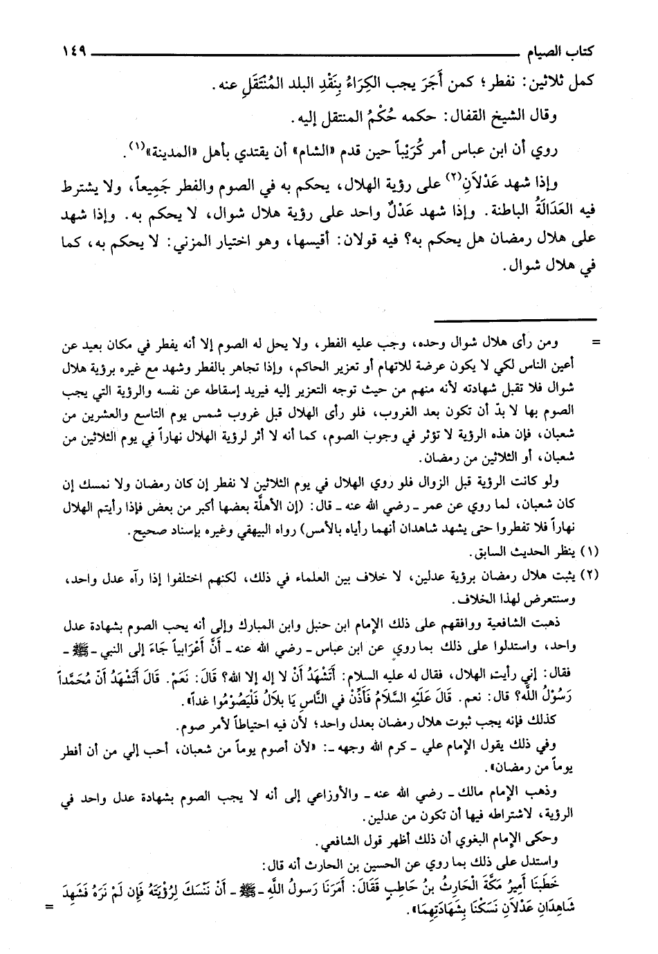 وإذا شهد عدلان على رؤية الهلال، يحكم به في الصوم والفطر جميعاً، ولا يشترط فيه العدالة الباطنة. وإذا شهد عدل واحد على رؤية هلال شوال، لا يحكم به. وإذا شهد على هلال رمضان هل يحكم به؟ فيه قولان: أقيسها، وهو اختيار المزني: لا يحكم به، كما في هلال شوال.