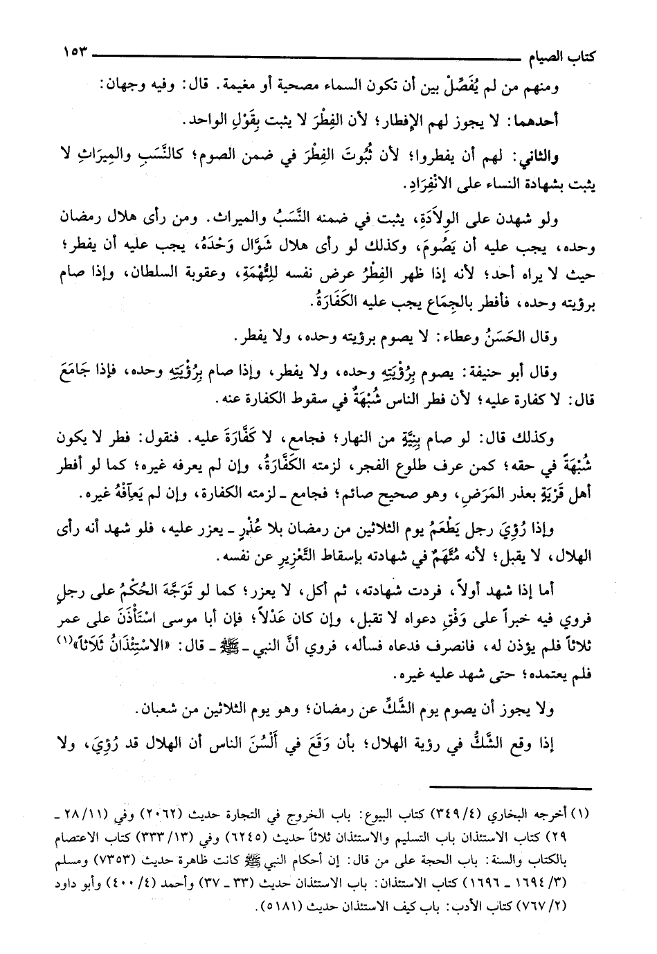 ولو شهدن على الولادة، يثبت في ضمنه النسب والميراث. ومن رأى هلال رمضان وحده، يجب عليه أن يصوم، وكذلك لو رأى هلال شوال وحده، يجب عليه أن يفطر؛ حيث لا يراه أحد؛ لأنه إذا ظهر الفطر عرض نفسه للتهمة، وعقوبة السلطان، وإذا صام برؤيته وحده، فأفطر بالجماع يجب عليه الكفارة.