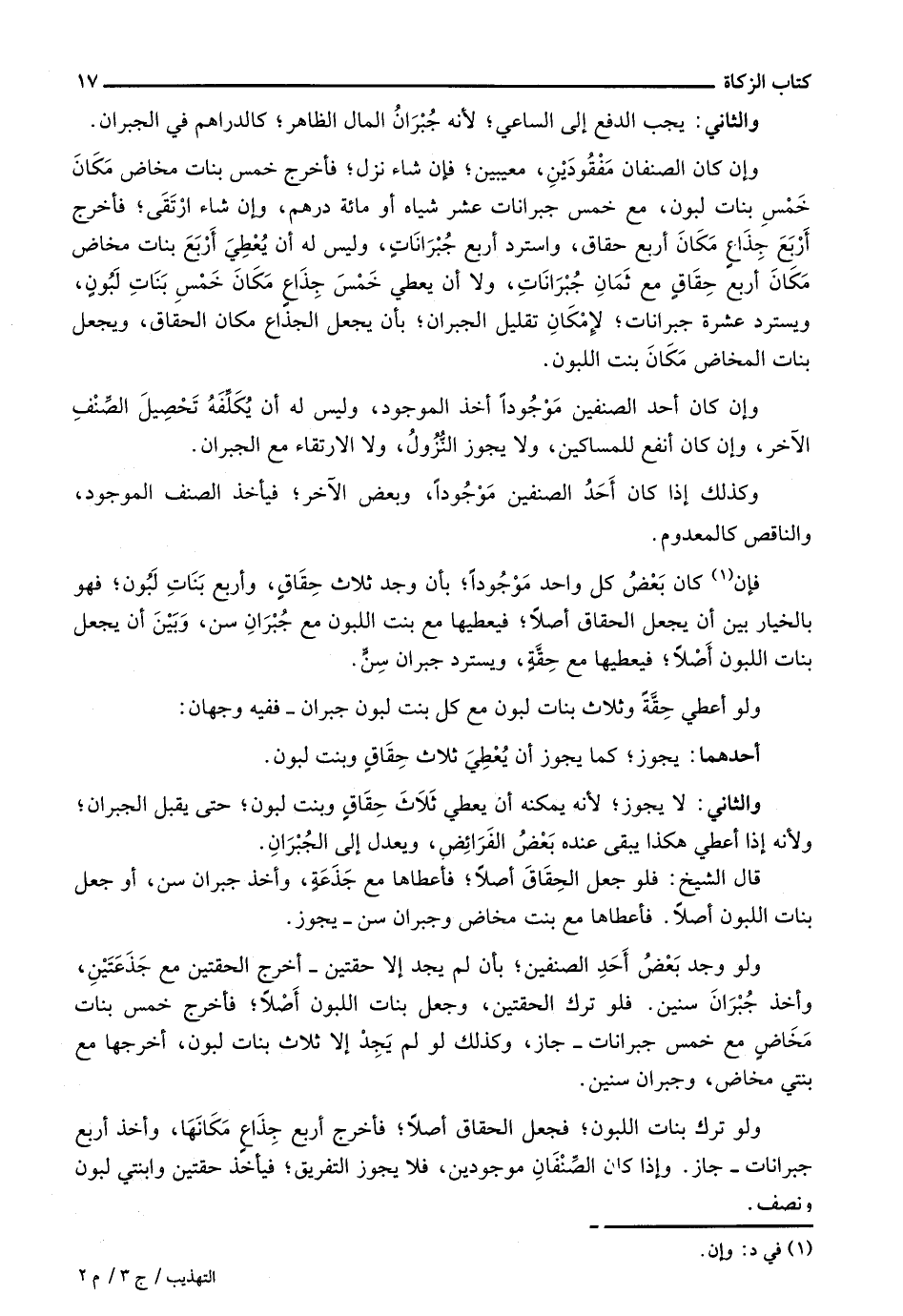وإن كان الصنفان مفقودين، معيبين؛ فإن شاء نزل؛ فأخرج خمس بنات مخاض مكان خمس بنات لبون، مع خمس جبرانات عشر شياه أو مائة درهم، وإن شاء ارتقى؛ فأخرج أربع جذاع مكان أربع حقاق، واسترد أربع جبرانات، وليس له أن يعطي أربع بنات مخاض مكان أبع حقاق مع ثمان جبرانات، ولا أن يعطي خمس جذاع مكان خمس بنات لبون، ويسترد عشرة جبرانات؛ لإمكان تقليل الجبران؛ بأن يجعل الجذاع مكان الحقاق، ويجعل بنات المخاض مكان بنت اللبون.
