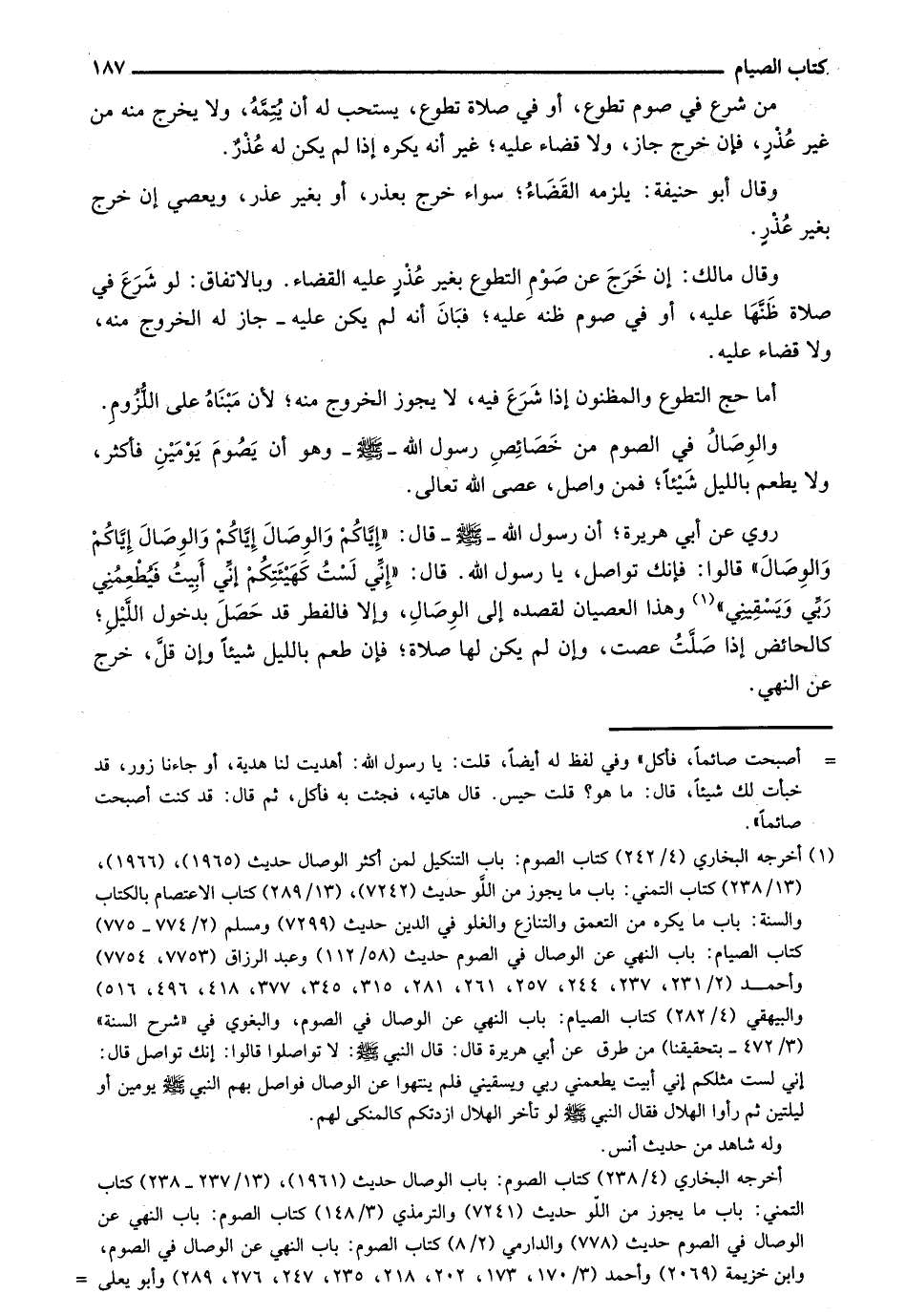 روي عن أبي هريرة؛ أن رسول الله - صلى الله عليه وسلم - قال: "إياكم والوصال إياكم والوصال إياكم والوصال" قالوا: فإنك تواصل، يا رسول الله. قال: "إني لست كهيئتكم إني أبيت فيطعمني ربي ويسقيني" وهذا العصيان لقصده إلى الوصال، وألا فالفطر قد حصل بدخول الليل؛ كالحائض إذا صلت عصت، وإن لم ين لها صلاة؛ فإن طعم بالليل شيئاً وإن قل، خرج عن النهي.