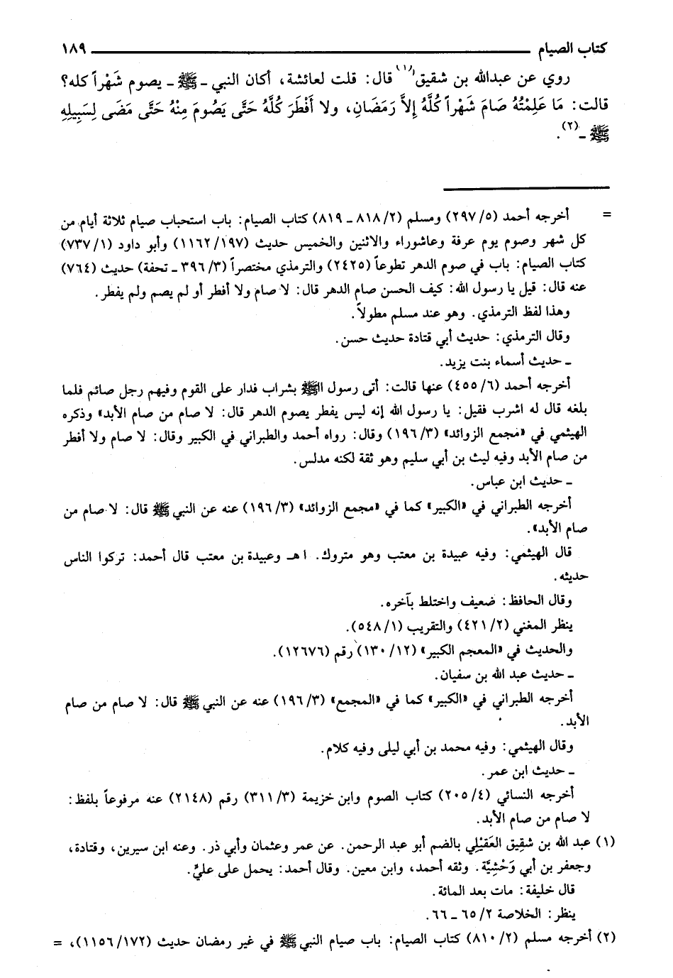 روي عن عبد الله بن شقيق قال: قلت لعائشة، أكان النبي - صلى الله عليه وسلم - يصوم شهراً كله؟ قالت: ما علمته صام شهراً كله إلا رمضان، ولا أفطر كله حتى يصوم منه حتى مضى لسبيله - صلى الله عليه وسلم -.