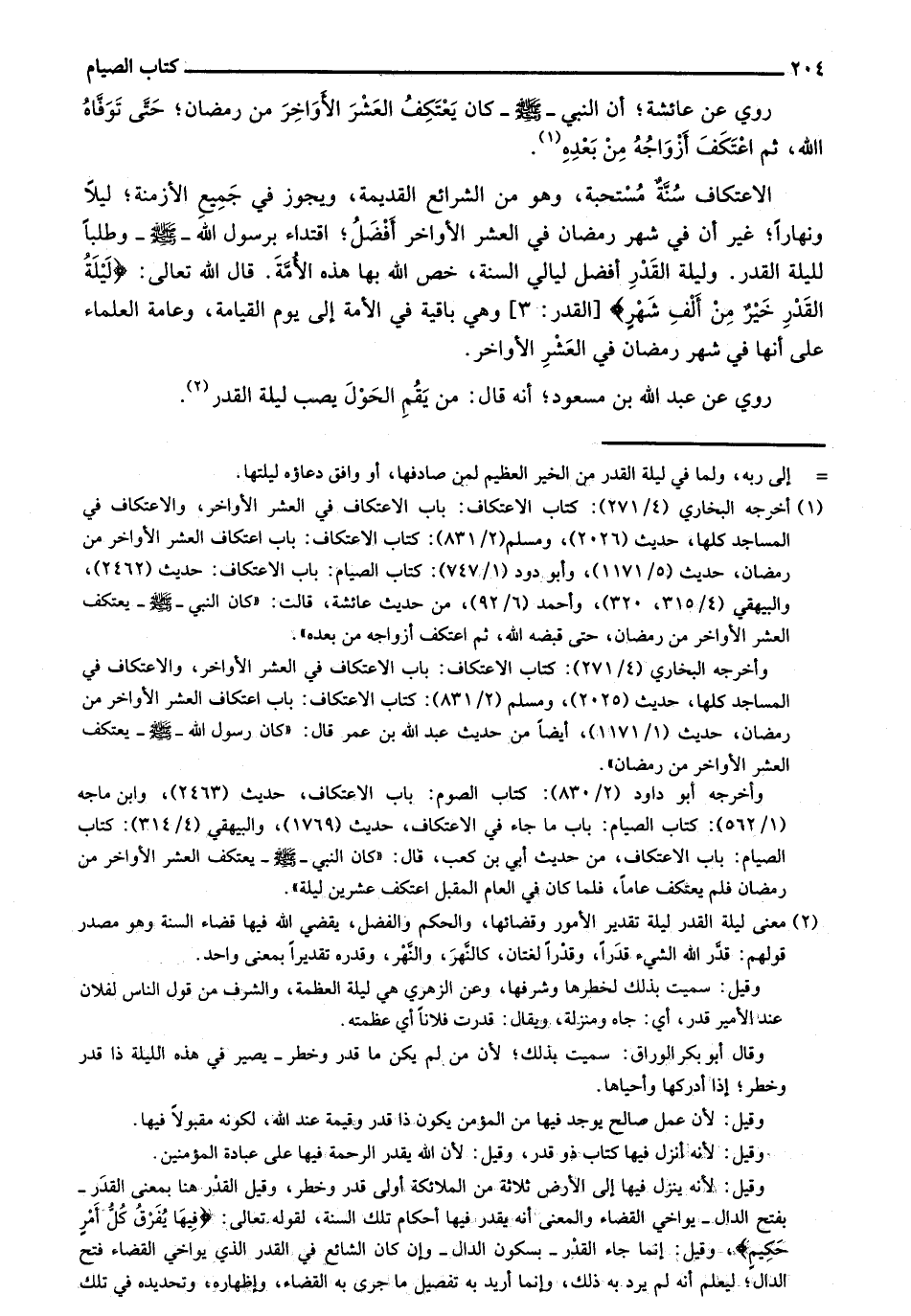الاعتكاف سُنة مستحبة، وهو من الشرائع القديمة، ويجوز في جميع الأزمنة؛ ليلاً ونهاراً؛ غير أن في شهر رمضان في العشر الأواخر أفضل؛ اقتداء برسول الله - صلى الله عليه وسلم - وطلباً لليلة القدر. وليلة القدر أفضل ليالي السنة، خص الله بها هذه الأمة. قال الله تعالى: {لَيْلَةُ الْقَدْرِ خَيْرٌ مِنْ أَلْفِ شَهْرٍ} [القدر: 3] وهي باقية في الأمة إلى يوم القيامة، وعامة العلماء على أنها في شهر رمضان في العشر الأواخر.