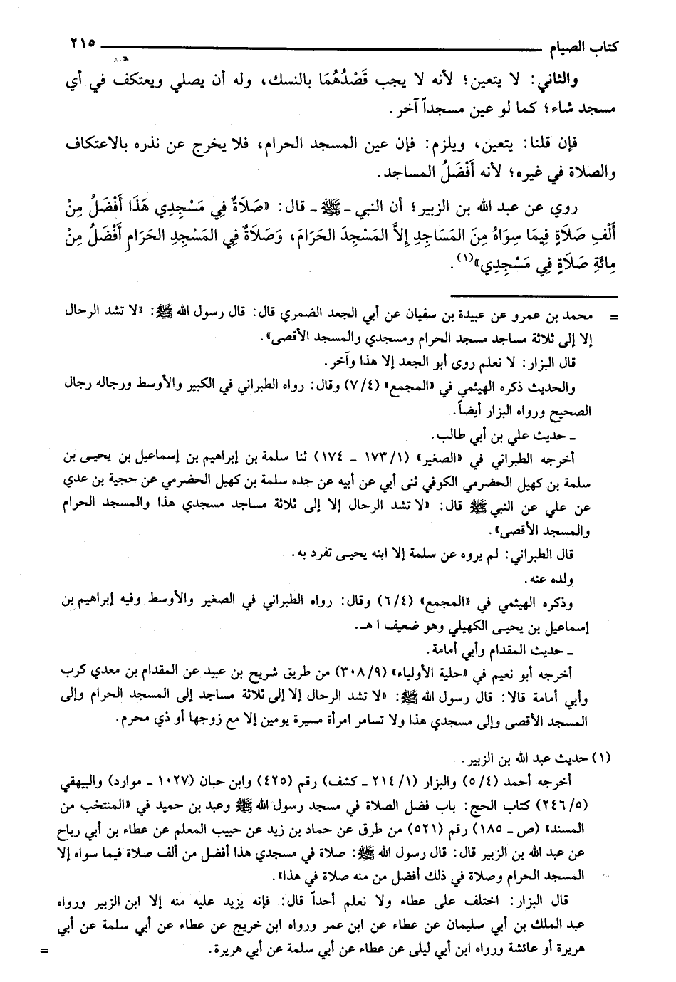 روي عن عبد الله بن الزبير؛ أن النبي - صلى الله عليه وسلم - قال: "صلاة في مسجدي هذا أفضل من ألف صلاة فيما سواه من المساجد إلا المسجد الحرام، وصلاة في المسجد الحرام أفضل من مائة صلاة في مسجدي".