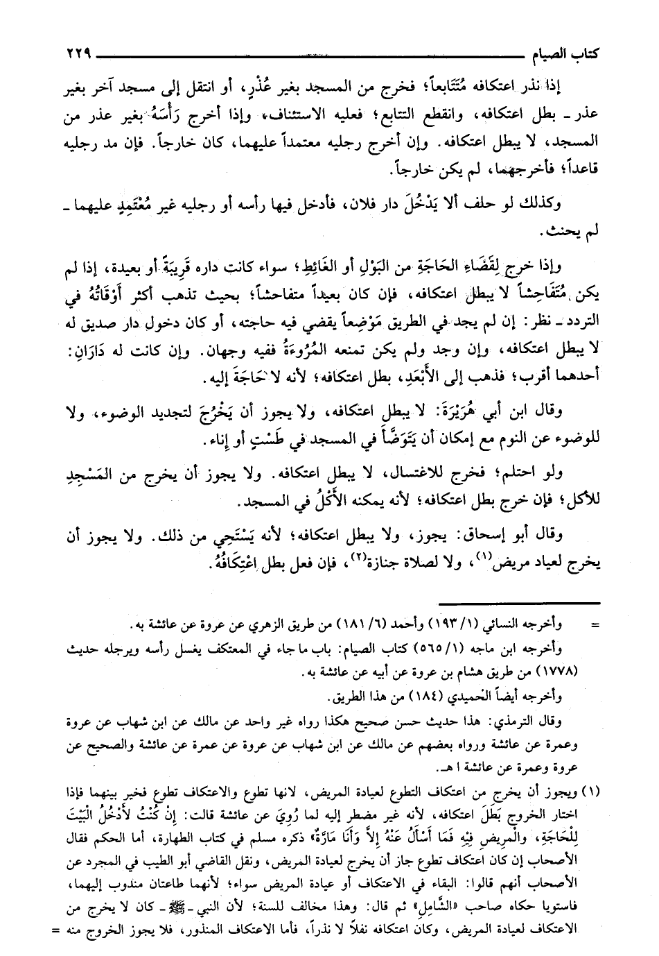 وإذا خرج لقضاء الحاجة من البول أو الغائط؛ سواء كانت داره قريبة أو بعيدة، إذا لم يكن متفاحشاً لا يبطل اعتكافه، فإن كان بعيداً متفاحشاً؛ بحيث تذهب أكثر أوقاته في التردد - نر: إن لم يجد في الطريق موضعاً يقضي فيه حاجته، أو كان دخول دار صديق له لا يبطل اعتكافه، وإن وجد ولم يكن تمنعه المروءة ففيه وجهان. وإن كانت له داران: أحدهما أقرب؛ فذهب إلى الأبعد، بطل اعتكافه؛ لأنه لا حاجة إليه.