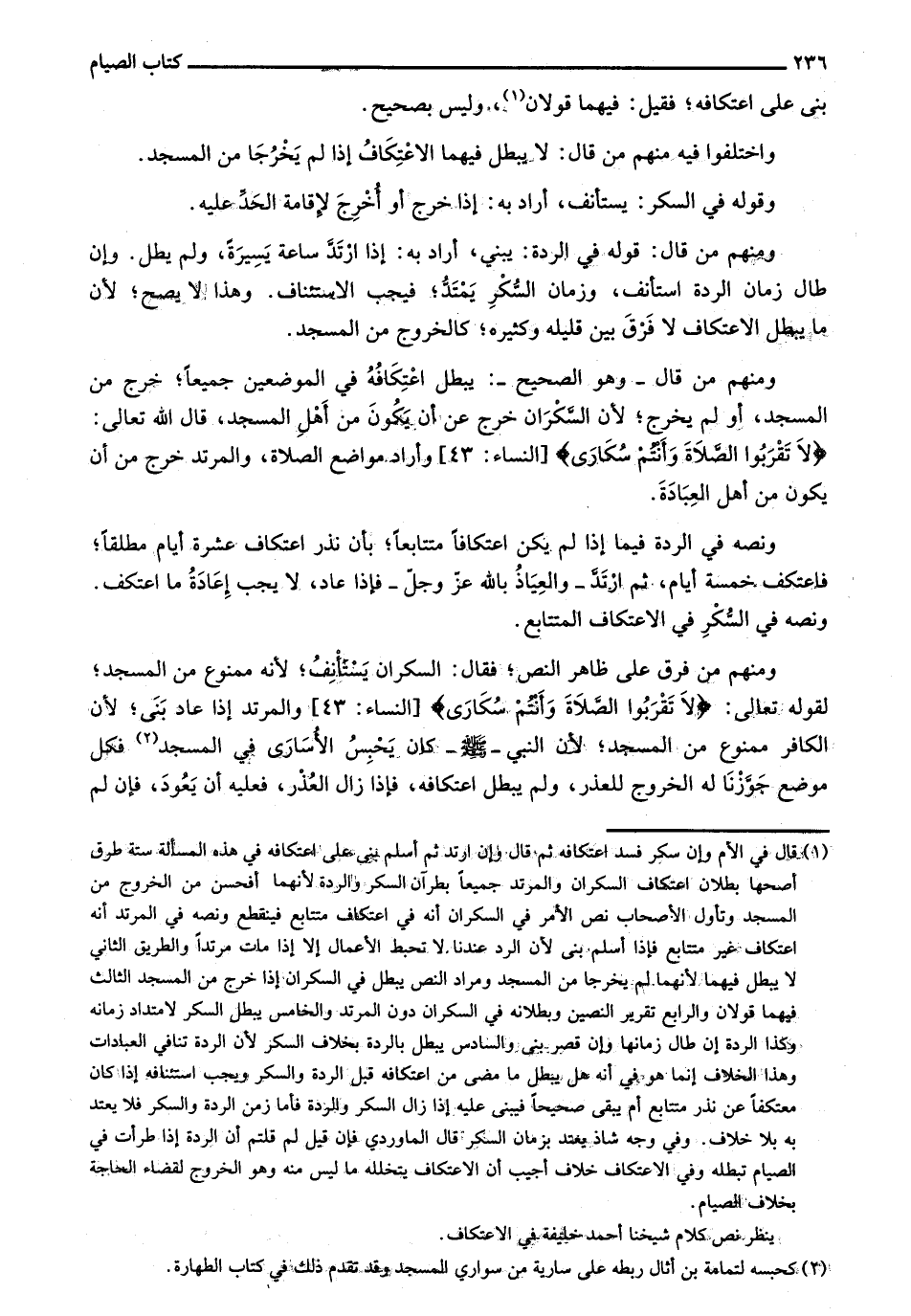 ونصه في الردة فيما إذا لم يكن اعتكافاً متتابعاً؛ بأن نر اعتكاف عشرة أيام مطلقاً؛ فاعتكف خمسة أيام، ثم ارتد - والعياذ بالله عز وجل - فإذا عاد، لا يجب إعادة ما اعتكف. ونصه في السكر في الاعتكاف المتتابع.