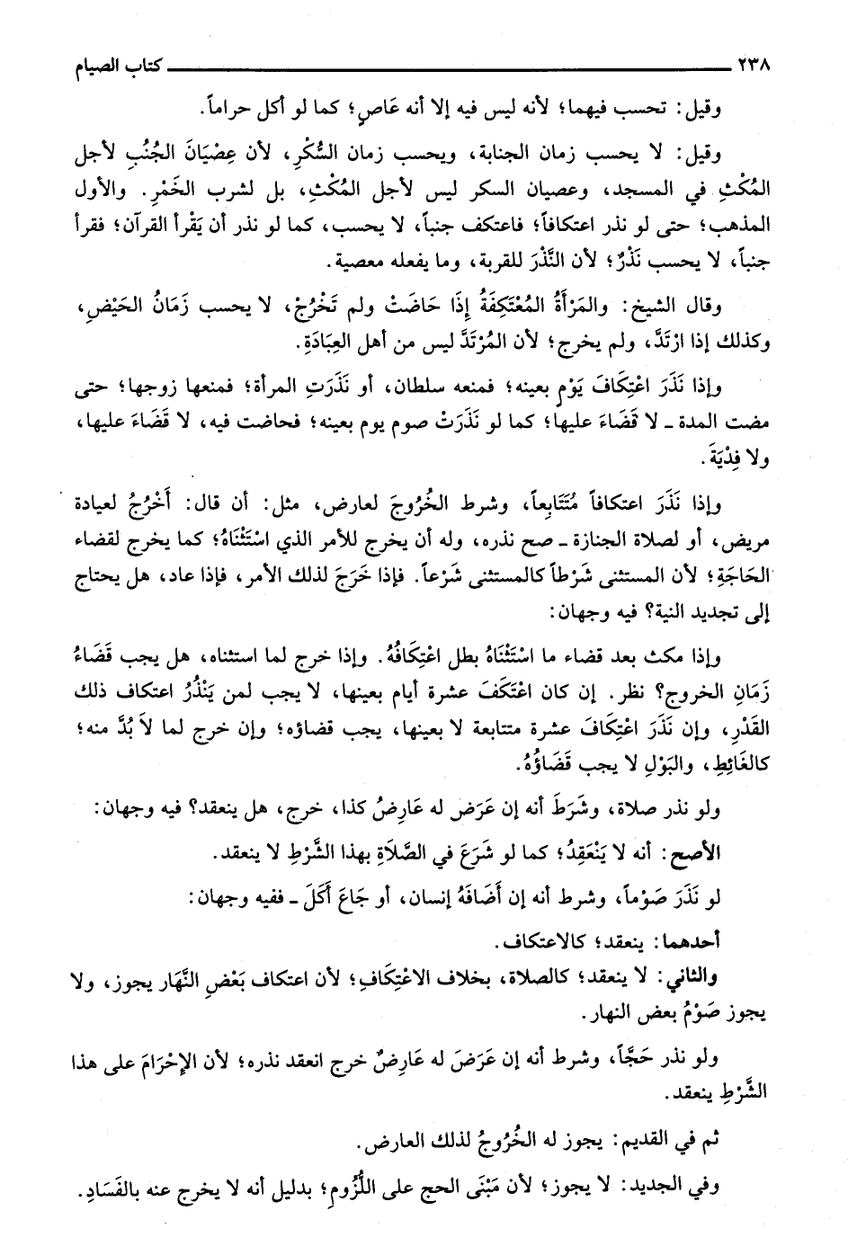 وقيل: لا يحسب زمان الجنابة، ويحسب زمان السكر، لأن عصيان الجُنب لأجل المُكثِ في المسجد، وعصيان السكر ليس لأجل المُكث، بل لشرب الخمر. والأول المذهب؛ حتى لو نذر اعتكافاً؛ فاعتكف جنباً، لا يحسب، كما لو نذر أن يقرأ القرآن؛ فقرأ جنباً، لا يحسب نذر؛ لأن النذر للقربة، وما يفعله معصية.