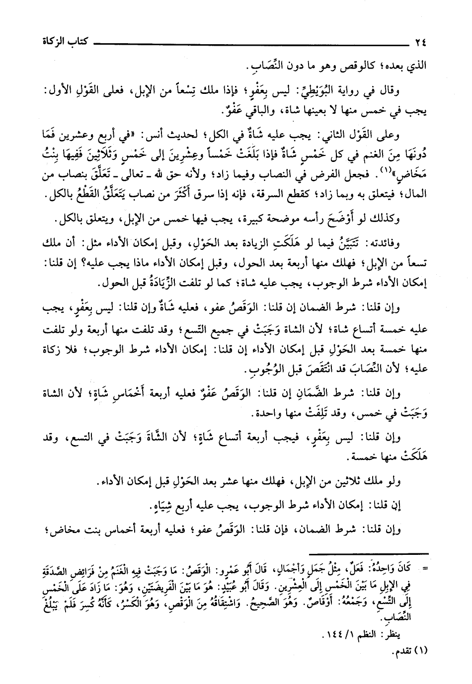 وعلى القول الثاني: يجب عليه شاة في الكل؛ لحديث أنس:"في أربع وعشرين فما دونها من الغنم في كل خمس شاة فإذا بلغت خمساً وعشرين إلى خمس وثلاثين ففيها بنت مخاض". فجعل الفرض في النصاب وفيما زاد؛ ولأنه حق لله - تعالى - تعلق بنصاب من المال؛ فيتعلق به وبما زاد؛ كقطع السرقة، فإنه إذا سرق أكثر من نصاب يتعلق القطع بالكل.