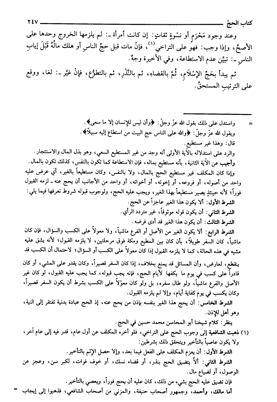 وعند وجود محرم أو نسوة ثقات: ن كانت امرأة -: لم يلزمها الخروج وحدها على الأصح، وإذا وجب فهو على التراخي، فإن مات قبل حج الناس أو هلك ماله قبل إياب الناس-: تبين عدم الاستطاعة، وفي الأخيرة وجه.