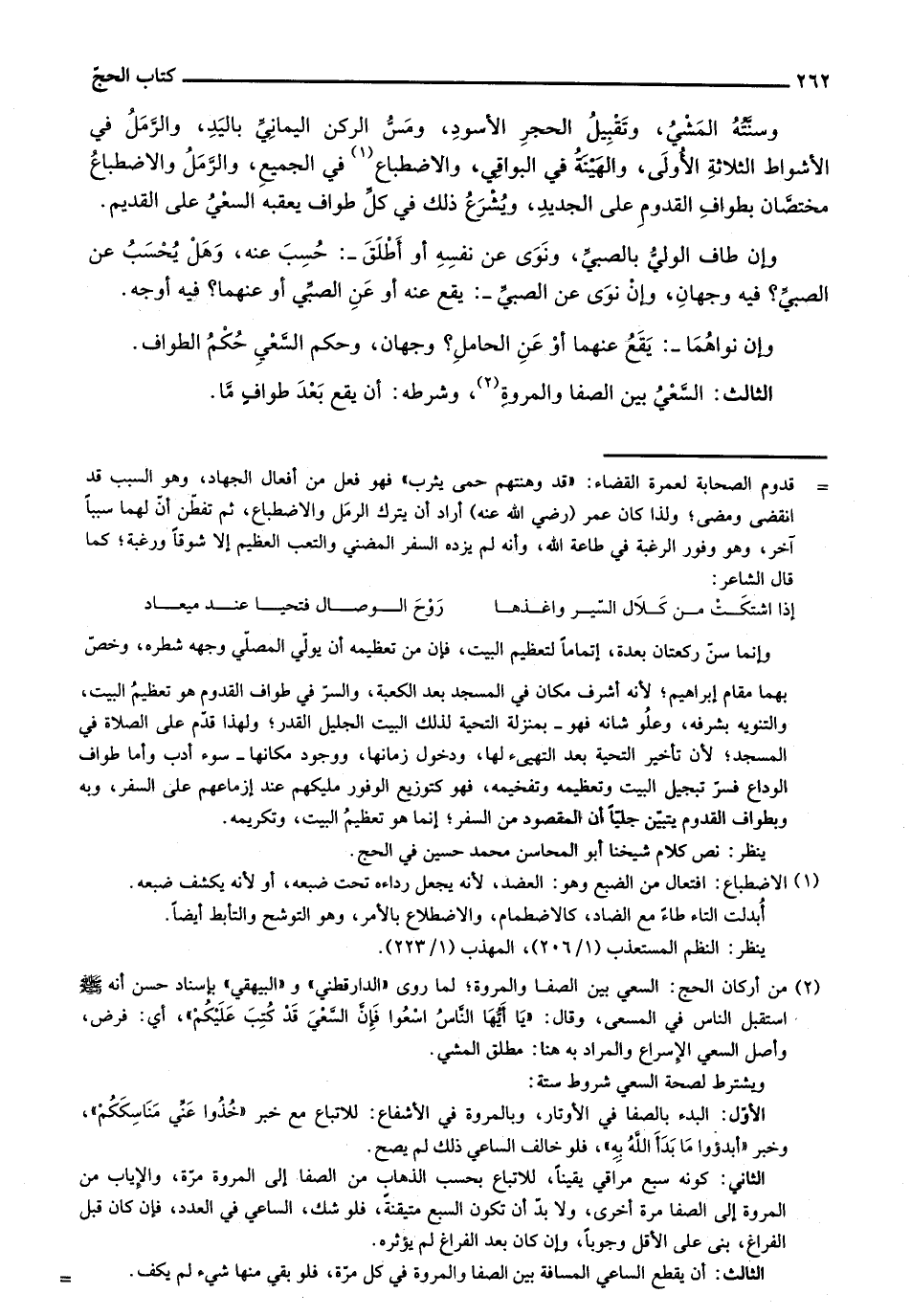 وسنته المشي، وتقبيل الحجر الأسود، ومس الركن اليماني باليد، والرمل في الأشواط الثلاثة الأولى، والهينة في البواقي، والاضطباع في الجميع، والرمل والاضطباع مختصان بطواف القدوم على الجديد، ويُشرع ذلك في كل طواف يعقبه السعي على القديم.