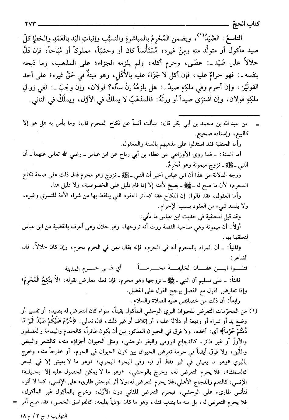 التاسع: الصيد، ويضمن المحرم بالمباشرة والتسبب وإثبات اليد بالعمد والخطإ كل صيد مأكول أو متولد منه ومن غيره، مستأنساً كان أو وحشياً، مملوكاً أو مباحاً، فإن دل حلالاً على صيد -: عصى، وحرم أكله، ولم يلزمه الجزاء؛ على المذهب، وما ذبحه بنفسه -: فهو حرام عليه، فإن أكل لا جزاء عليه بالأكل، وهو ميتة في حق غيره؛ على أحد القولين، وإن أحرم وفي ملكه صيد -: هل يلزمه إن سأله؟ قولان، وإن وجب-: ففي زوال ملكه قولان، وإن اشترى صيداً أو ورثة: فالمذهب لا يملك في الأول، ويملك في الثاني