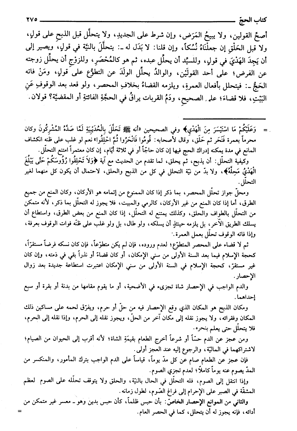 أصح القولين، ولا يبيح المرض، وإن شرط على الجديد، ولا يتحلل قبل الذبح على قول، ولا قبل الحلق إن جعلناه نُسكاً، وإن قلنا: لا بدل له -: يتحلل بالنية في قول، ويصير إلى أن يجد الهدى في قول، وللسيد أن يحلل عبده، ثم هو المحصر، وللزوج أن يحلل زوجته عن الفرض؛ على أحد القولين، والوالد يحلل الولد عن التطوع على قول، ومن فاته الحج -: فيتحلل بأفعال العمرة، ويلزمه القضاء بخلاف المحصر، ولو قعد بعد الوقوف عن البيت، فلا قضاء؛ على الصحيح، ودم القربات يراق في الحجة الفائتة أو المقضية؟ قولان.