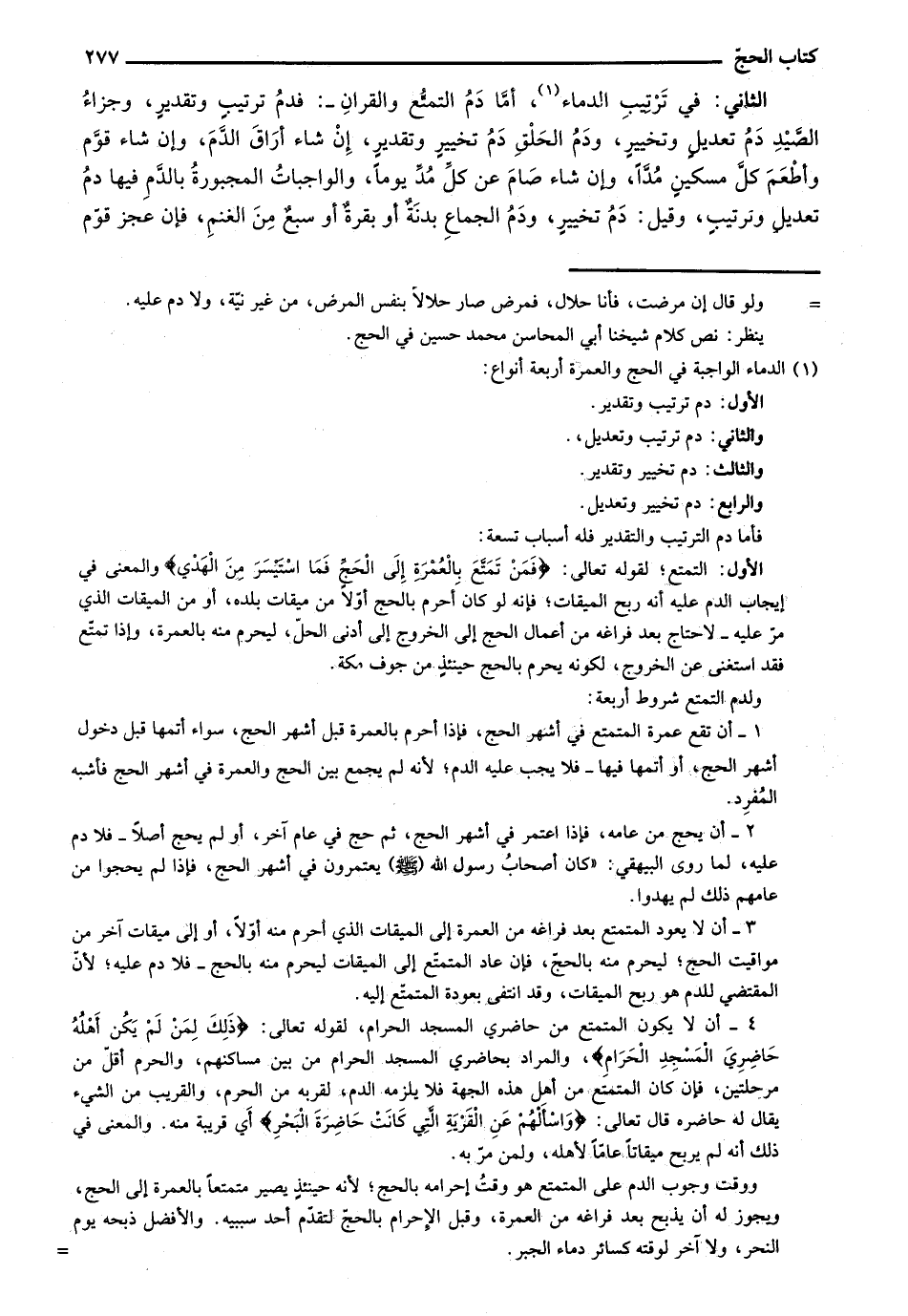 الثاني: في ترتيب الدماء، أما دم التمتع والقران -: فدم ترتيب وتقدير، وجزاء الصيد دم تعديل وتخيير، ودم الحلق دم تخيير وتقدير، عن شاء أراق الدم، وإن شاء قوم وأطعم كل مسكين مُداً، وإن شاء صام عن كل مد يوماً، والواجبات المجبورة بالدم فيها دم تعديل وترتيب، وقيل: دم تخيير، ودم الجماع بدنة أو بقرة أو سبع من الغنم، فإن عجز قوم