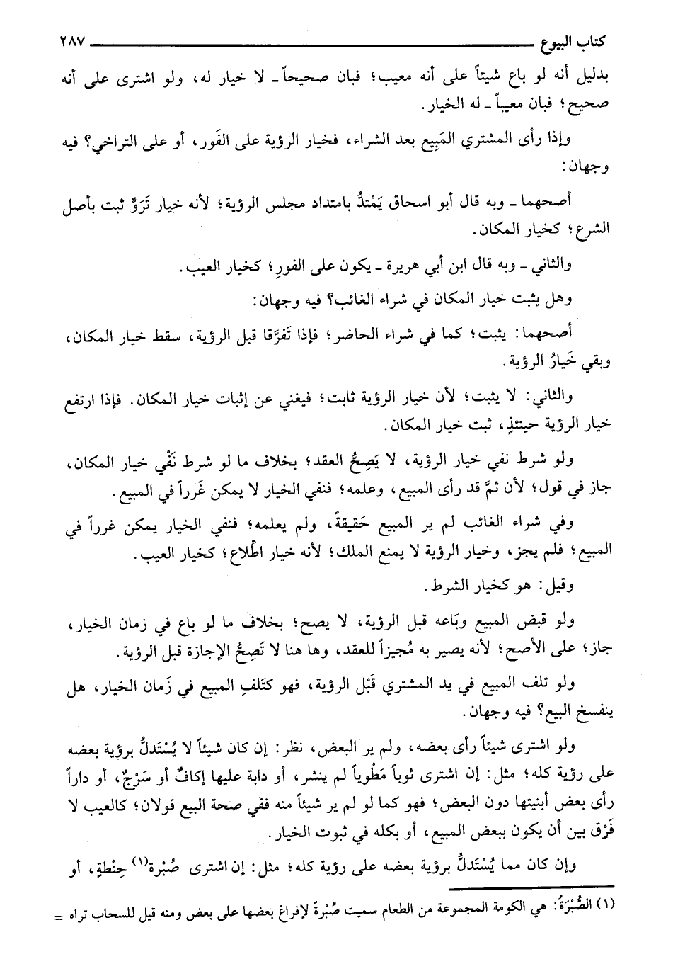 ولو شرط نفي خيار الرؤية، لا يصح العقد؛ بخلاف ما لو شرط نفي خيار المكان، جاز فيقول؛ لأن ثمَّ قدر أى المبيع، وعلمه؛ فنفي الخيار لا يمكن غرراً في المبيع.