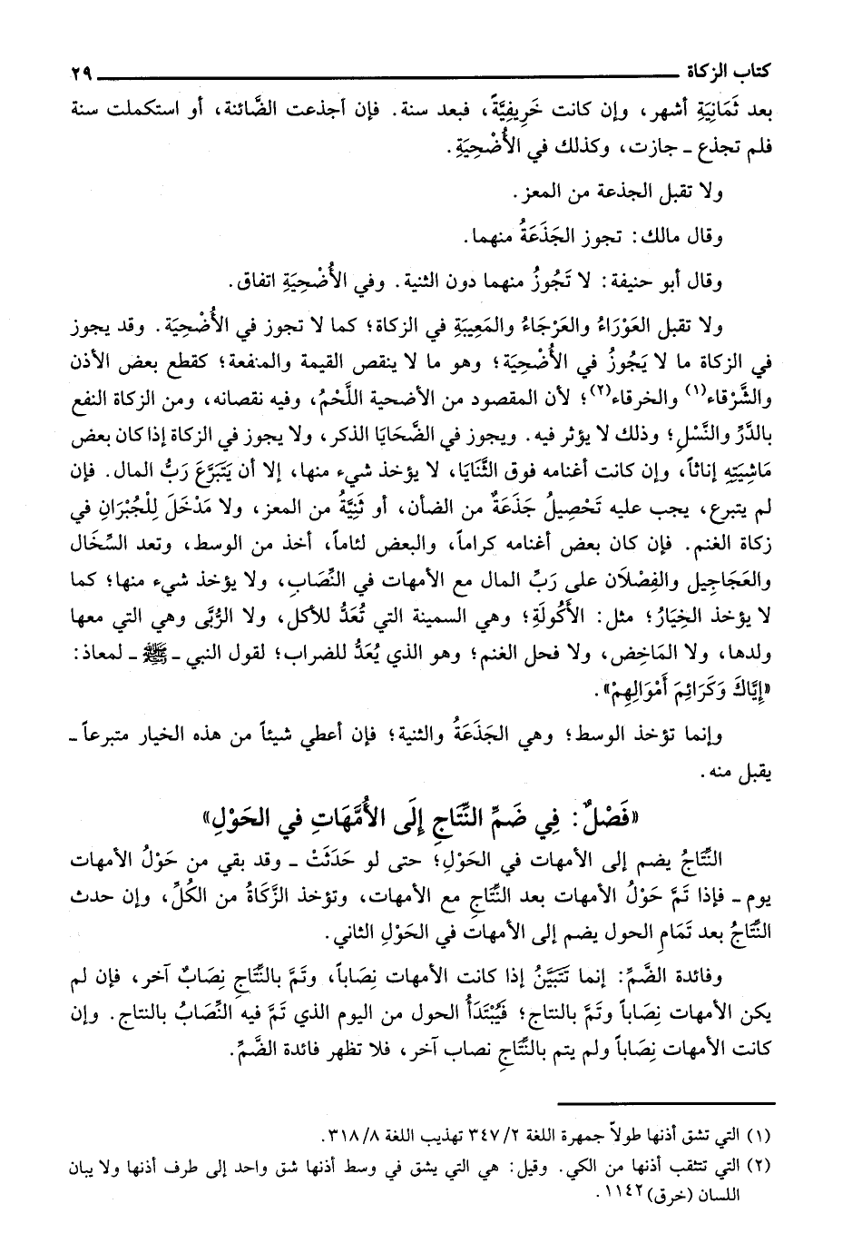 وفائدة الضم: إنما تتبين إذا كانت الأمهات نصاباً، وتم بالنتاج نصاب آخر، فإن لم يكن الأمهات نصاباً وتم بالنتاج؛ فيبتدأ الحول من اليوم الذي تم فيه النصاب بالنتاج. وإن كانت الأمهات نصاباً ولم يتم بالنتاج نصاب آخر، فلا تظهر فائدة الضم.
