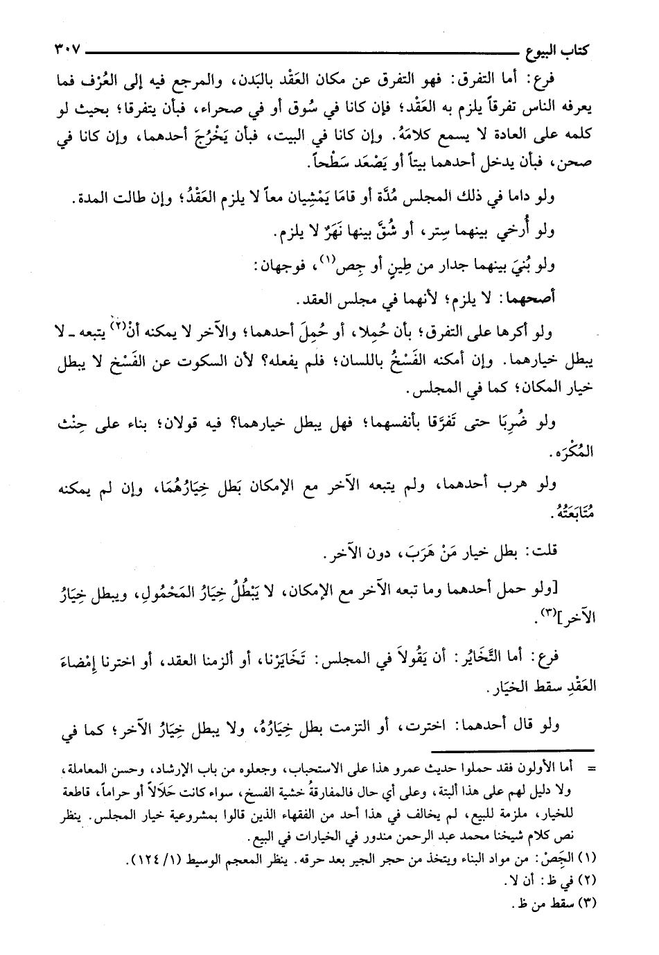 فرع: أما التفرق: فهو التفرق عن مكان العقد بالبدن، والمرجع فيه إلى العُرف فما يعرفه الناس تفرقاً يلزم به العقد؛ فن كانا في سوق أو في صحراء، فبأن يتفرقا؛ بحيث لو كلمه على العادة لا يسمع كلامه. وإن كانا في البيت، فبأن يخرج أحدهما، وإن كانا في صحن، فبأن يدخل أحدهما بيتاً أو يصعد سطحاً.