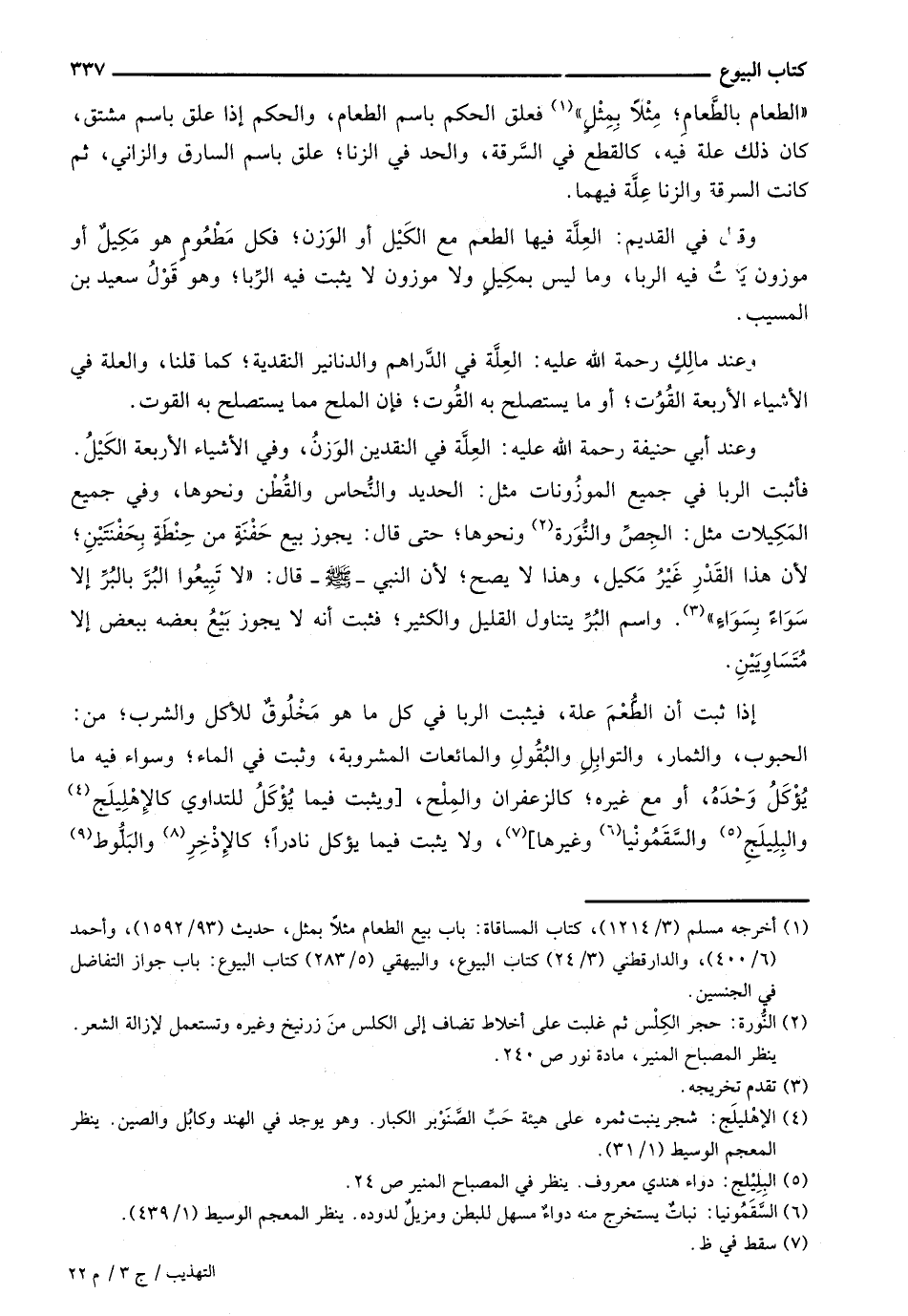 وعند أبي حنيفة رحمة الله عليه: العلة في النقدين الوزن، وفي الأشياء الأربعة الكيل. فأثبت الربا في جميع الموزونات مثل: الحديد والنحاس والقطن ونحوها، وفي جميع المكيلات مثل: الجص والنورة ونحوها؛ حتى قال يجوز بيع حفنة من حنطة بحفنتين؛ لأن هذا القدر غير مكيل، وهذا لا يصح؛ لأن النبي - صلى الله عليه وسلم - قال: "لا تبيعوا البُرَّ بالبر إلا سواء بسواء". واسم البر يتناول القليل والكثير؛ فثبت أنه لا يجوز بيع بعضه ببعض إلا متساويين.