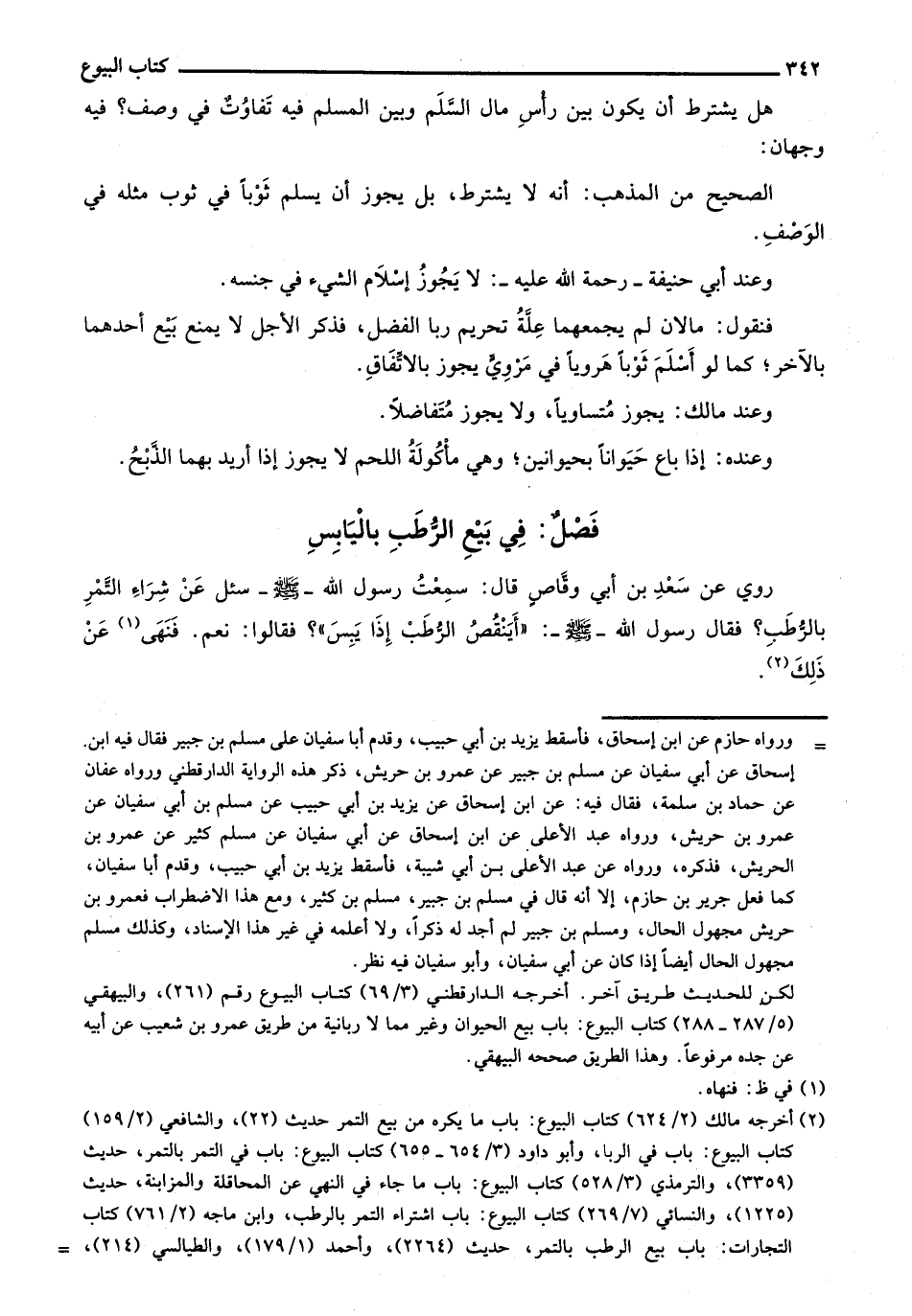 روي عن سعد بن أبي وقاص قال سمعت رسول الله - صلى الله عليه وسلم - سئل عن شراء التمر بالرطب؟ فقال رسول الله - صلى الله عليه وسلم -: "أينقص الرطب إذا يبس"؟ فقالوا: نعم. فنهى عن ذلك.