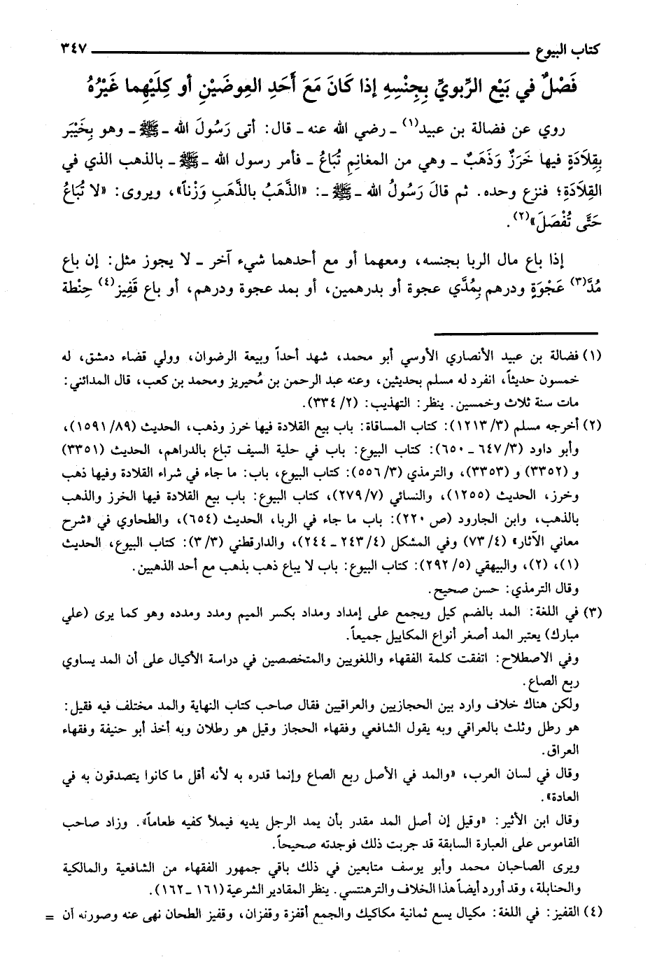 روي عن فضالة بن عبيد - رضي الله عنه - قال: أتى رسول الله - صلى الله عليه وسلم - وهو بخيبر بقلادة فيها خرز وذهب - وهي من المغانم تباع - فأمر رسول الله - صلى الله عليه وسلم - بالذهب الذي في القلادة؛ فنزع وحده. ثم قال رسول الله - صلى الله عليه وسلم -:"الذهب بالذهب وزناً"، ويروي: "لا تباع حتى تفصل".