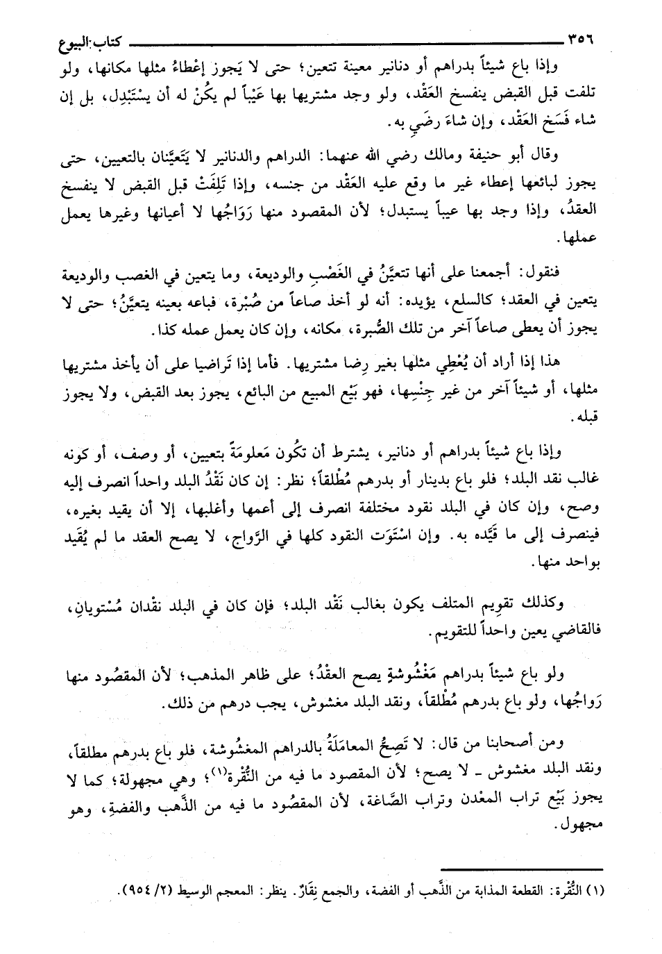 وإذا باع شيئاً بدراهم أو دنانير، يشترط أن تكون معلومة بتعيين، أو وصف، أو كونه غالب نقد البلد؛ فلو باع بدينار أو بدرهم مطلقاً؛ نظر: إن كان نقد البلد واحداً انصرف إليه وصح، وإن كان في البلد نقود مختلفة انصرف إلى أعمها وأغلبها، إلا أن يقيد بغيره، فينصرف إلى ما قيده به. وإن استوت النقود كلها في الرواج، لا يصح العقد ما لم يقيد بواحد منها.