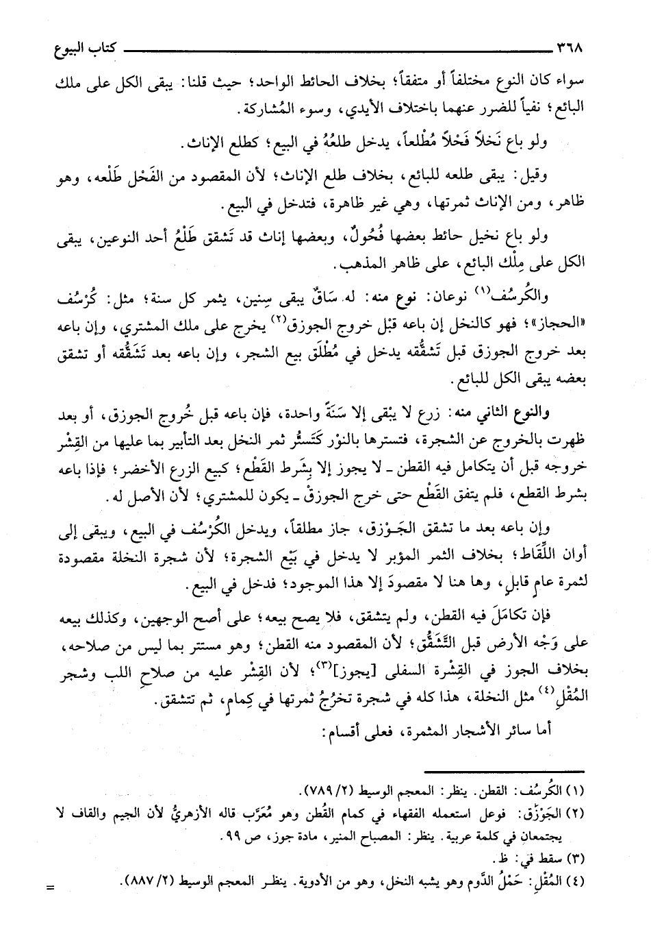 والكُرسف نوعان: نوع منه: له ساق يبقى سنين، يثمر كلسنة؛ مثل: كرسف "الحجاز"؛ فهو كالنخل إن باعه قبل خروج الجوزق يخرج على مل المشتري، وإن باعه بعد خروج الوزق قبل تشققه يدخل في مطلق بيع الشر، وإن باعه بعد تشققه أو تشقق بعضه يبقى الكل للبائع.