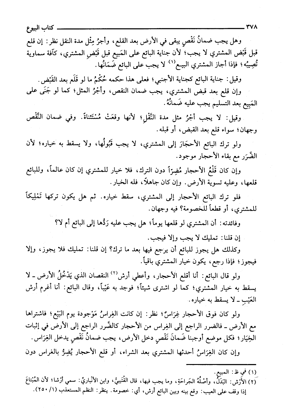 وهل يجب ضمان نقص يبقى في الأرض بعد القلع، وأجر مثل مدة النقل نظر: ن قلع قبل قبض المشتري لا يجب؛ لأن جناية البائع على المبيع قبل قبض المشتري، كافة سماوية نصيبه؛ فإذا أجاز المشتري البيع لا يجب على البائع ضمانها.