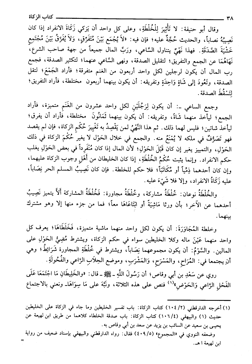 وجمع الساعي -: أن يكون لرجلين لكل واحد عشرون من الغنم متميزة، فأراد الجمع؛ ليأخذ منهما شاة، وتفريقه: أن يكون بينهما ثمانون مختلطة، فأراد أن يفرق؛ ليأخذ شاتين؛ فليس لهما ذلك. ثم هذا النهي لمن يقصد به تغيير حكم الزكاة، فن لم يقصد فهو تصرف في ملكه لا يمنع منه. والجمع في خلال الأول لا يغير حكم الزكاة في ذلك الحول، والتمييز يغير إن كان قبل الحول؛ لأن المال إذا كان منفرداً في بعض الحول يغلب حكم الانفراد. وإنما يثبت حكم الخلطة، إذا كان الخليطان من أهل وجوب الزكاة عليهما، وإن كان أحدهما ذميا أو مكاتباً؛ فلاحكم للخلطة. فإن كن نصيب المسلم الحر نصاباً، عليه زكاة الانفراد، وألا فلا شيء عليه.