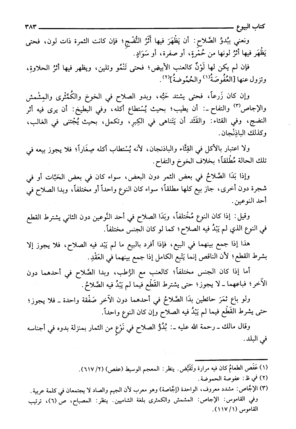 وقال مالك -رحمة الله عليه -: بدو الصلاح في نوع من الثمار بمنزلة بدوه في أجناسه في البلد.