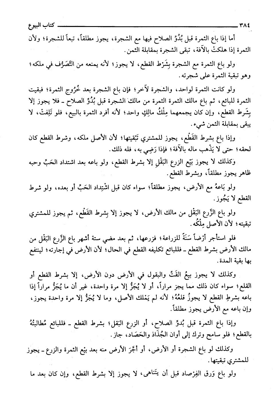 وكذلك لا يجوز بيع القت والبقول في الأرض دون الأرض، إلا بشرط القطع أو القلع؛ سواء كان ذلك مما يجز مراراً، أو لا يُجز إلا مرة واحدة، غير أن ما يُجز مراراً إذا باعه بشرط القطع لا يجوز قلعه؛ لأنه لم يملك الأصل، وما لا يُجز إلا مرة واحدة يجوز، وإن باعه مع الأرض يجوز مطلقاً.