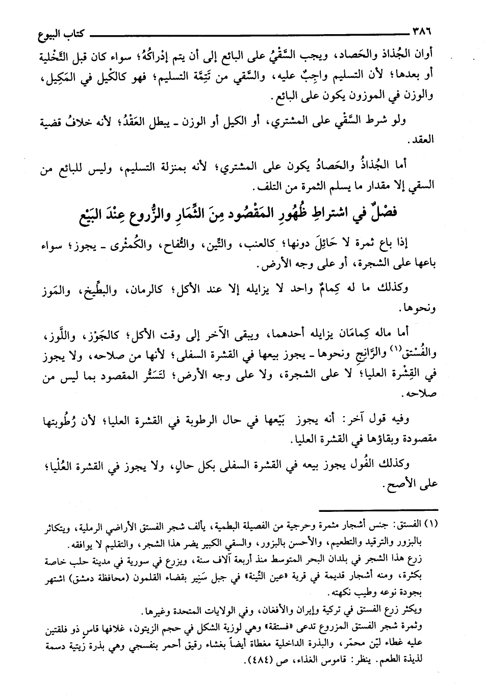 أما ماله كمامان يزايله أحدهما، ويبقى الآخر إلى وقت الأكل؛ كالجوز، واللوز، والفستق والرانج ونحوها - يجوز بيعها في القشرة السفلى؛ لأنها من صلاحه، ولا يجوز في القشرة العليا؛ لا على القشرة، ولا على وجه الأرض؛ لتستر المقصود بما ليس من صلاحه.