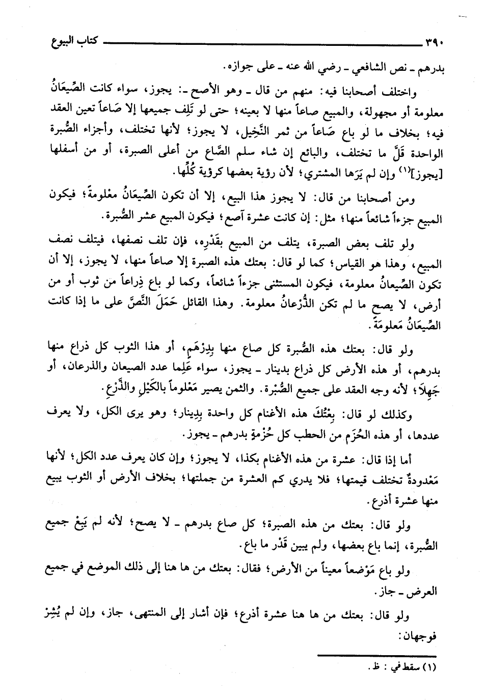 ولو تلف بعض الصبرة، يتلف من المبيع بقدره، فإن تلف نصفها، فيتلف نصف المبيع، وهذا هو القياس؛ كما لو قال بعتك هذه الصبرة غلا صاعاً منها، لا يجوز، إلا أن تكون الصيعان معلومة، فيكون المستثنى جزءاً شائعاً، وكما لو باع ذراعاً من ثوب أو من أرض، لا يصح ما لم تكن الذرعان معلومة. وهذا القائل حمل النص على ما إذا كانت الصيعان معلومة.