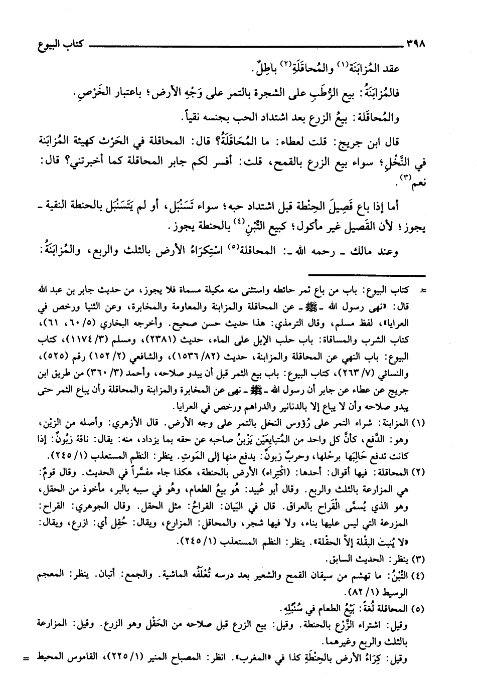 قال ابن جريج: قلت لعطاء: ما المحاقلة؟ قال: المحاقلة في الحرث كهيئة المزابنة في النخل؛ سواء بيع الزرع بالقمح، قلت: أفسر لكم جابر المحاقلة كما أخبرتني؟ قال: نعم.