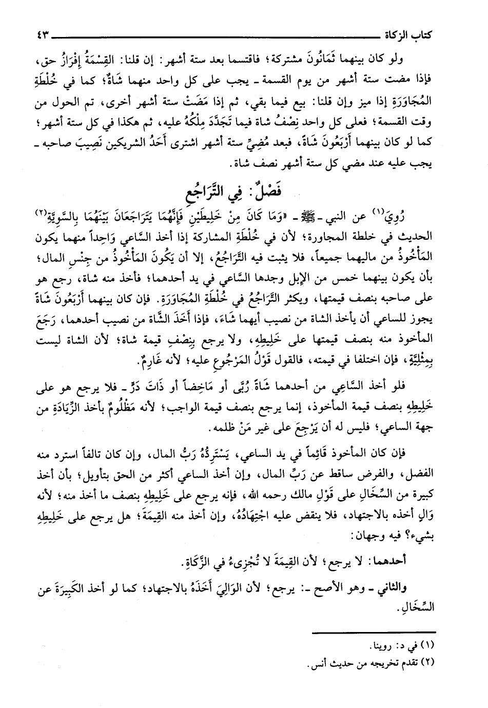 رُوي عن النبي - صلى الله عليه وسلم- "وما كان من خليطين فإنهما يتراجعان بينهما بالسوية الحديث في خلطة المجاورة؛ لأن في خلطة المشاركة إذا أخذ الساعي واحداً منهما يكون المأخوذ من ماليهما جميعاً، فلا يثبت فيه التراجع، إلا أن يكون المأخوذ من جنس المال؛ بأن يكون بينهما خمس من الإبل وجدها الساعي في يد أحدهما؛ فأخذ منه شاة، رجع هو على صاحبه بنصف قيمتها، ويكثر التراجع في خلطة المجاورة. فإن كان بينهما أربعون شاة يجوز للساعي أن يأخذ الشاة من نصيب أيهما شاء، فإذا أخذ الشاة من نصيب أحدهما، رجع المأخوذ منه بنصف قيمتها على خليطه، ولا يرجع بنصف قيمة شاة؛ لأن الشاة ليست بمثلية، فإن اختلفا في قيمته، فالقول قول المروع عليه؛ لأنه غارم.